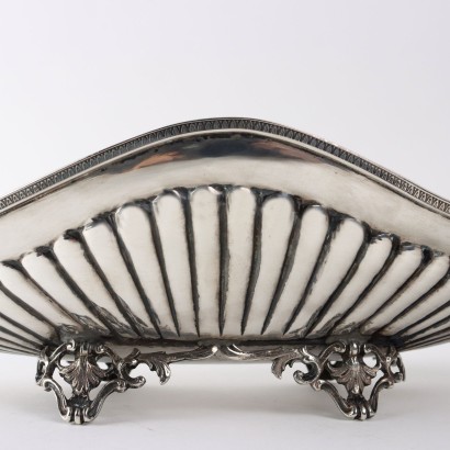 Boat-shaped centrepiece in fluted and chiseled silver supported by four feet with leafy scrolls. Swan-shaped handles, silver marks incised under the Greek-chiseled edge. Silversmith's mark barely legible. 810 grams.