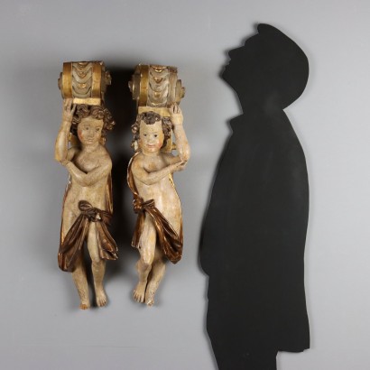 Pair of carved, lacquered and gilded wooden caryatids. The pilasters consist of a curled shelf supported by a boy with a drape. Obvious missing parts including hands and feet, lacquering partially restored.