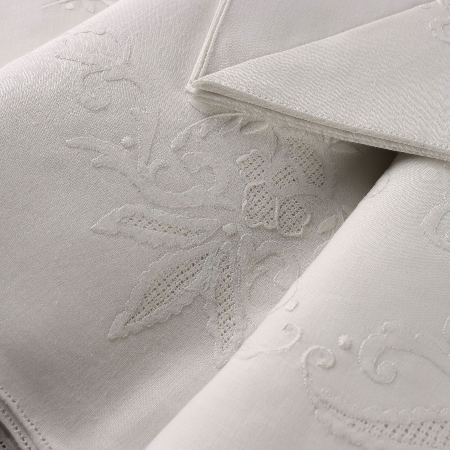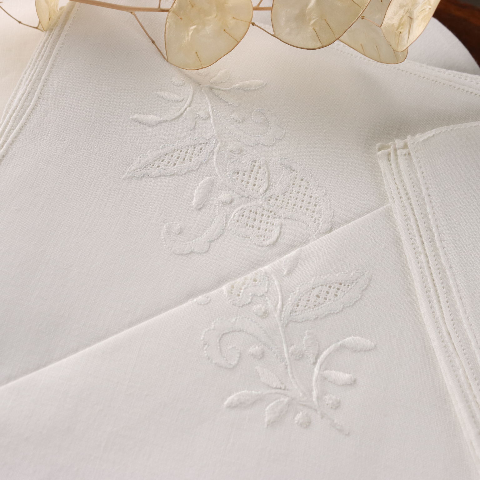 Beautiful tablecloth with 12 napkins plus 12 tea napkins embroidered in shadow stitch and rhodi stitch with a floral motif. Rectangular shape. White colour. Composition: linen. Dimensions: Tablecloth cm 280 x cm 174. Napkins cm 40 x cm 40. Tea napkins cm 20 x cm 20.