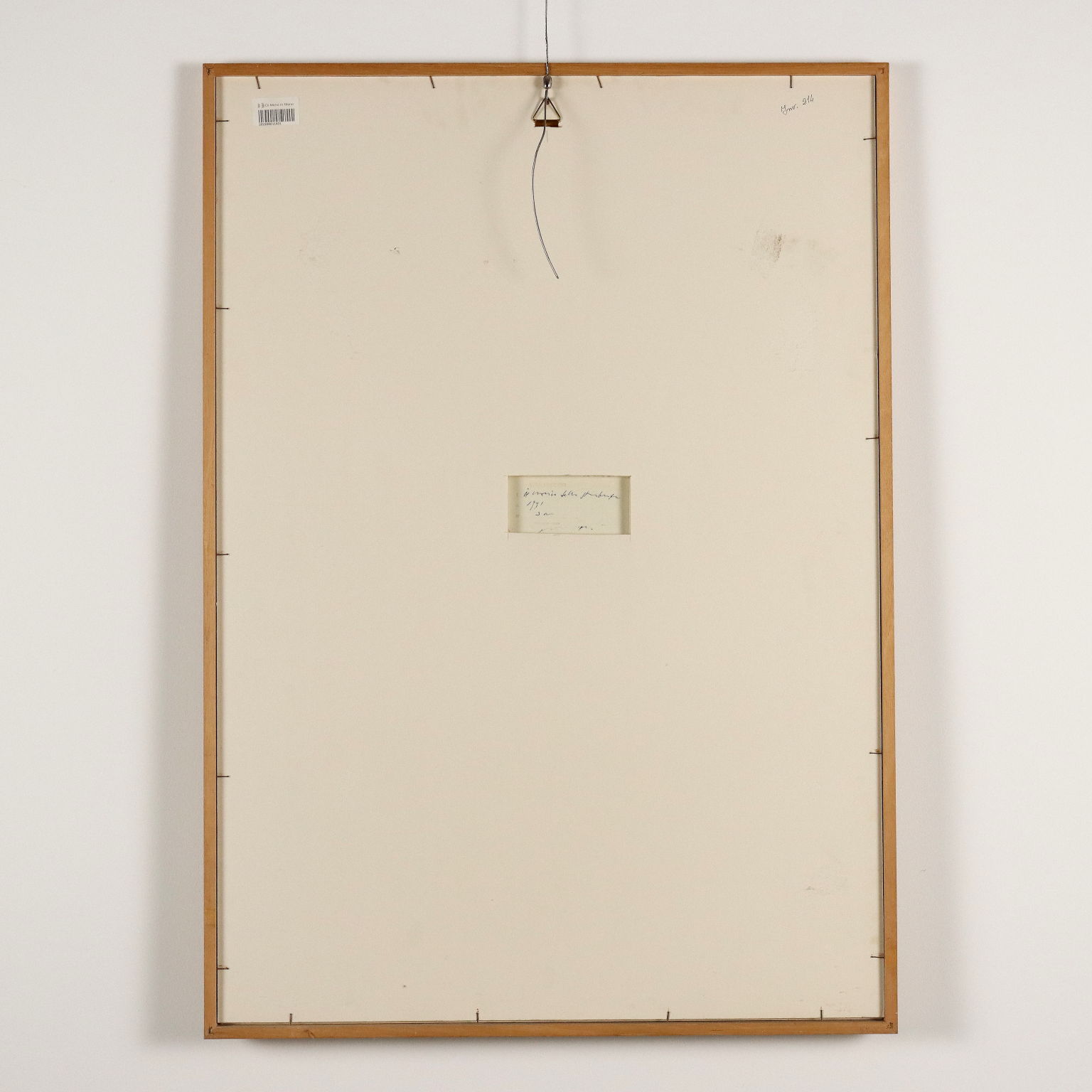 Mixed media on paper. On the back the artist's stamp with the signature, title and date of the work. Caccioni, an artist who was born, trained and still lives in Bologna, is one of the protagonists of a generation that has now reached a definitive linguistic maturity and occupies a prominent space within the contemporary artistic panorama. His research mainly uses unusual materials such as acetates, PVC and, more recently, stage backdrops of nineteenth-century theatrical works, on which he intervenes by painting shapes drawn from a personal memory and from suggestions coming from different cultures and historical periods. A recurring element in Luca Caccioni's work is writing, a self-signifying sign that designs the work and is capable of recounting thoughts; working by superimposition, the images are constructed by adding or subtracting color on the various supports. Work in frame.