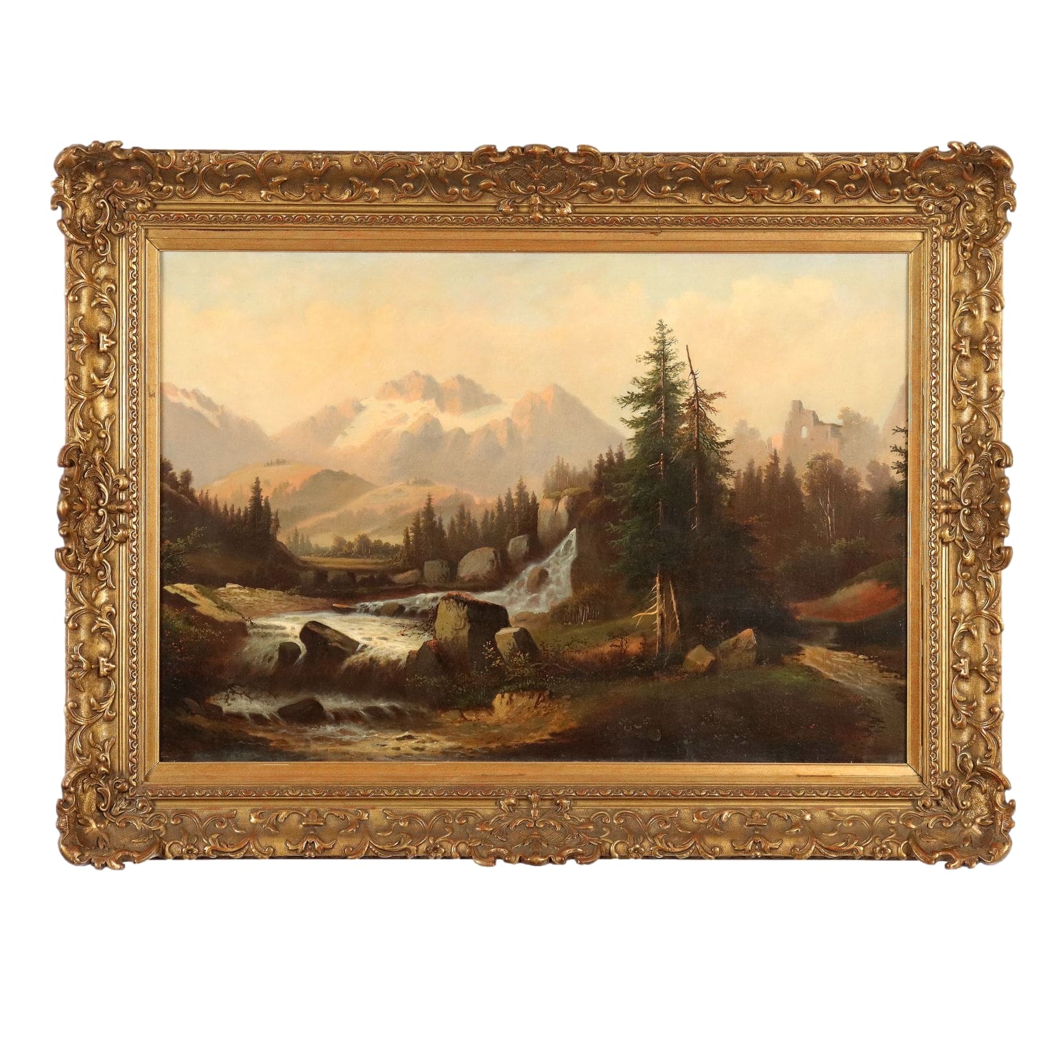Oil on canvas. Central European school of the late 19th-early 20th century. Unidentified signature on the lower right. The landscape glimpse shows a countryside with coniferous woods, crossed by a stream and dominated by rocky peaks. The painting is presented in a golden frame from the early 20th century, with decorations and friezes.