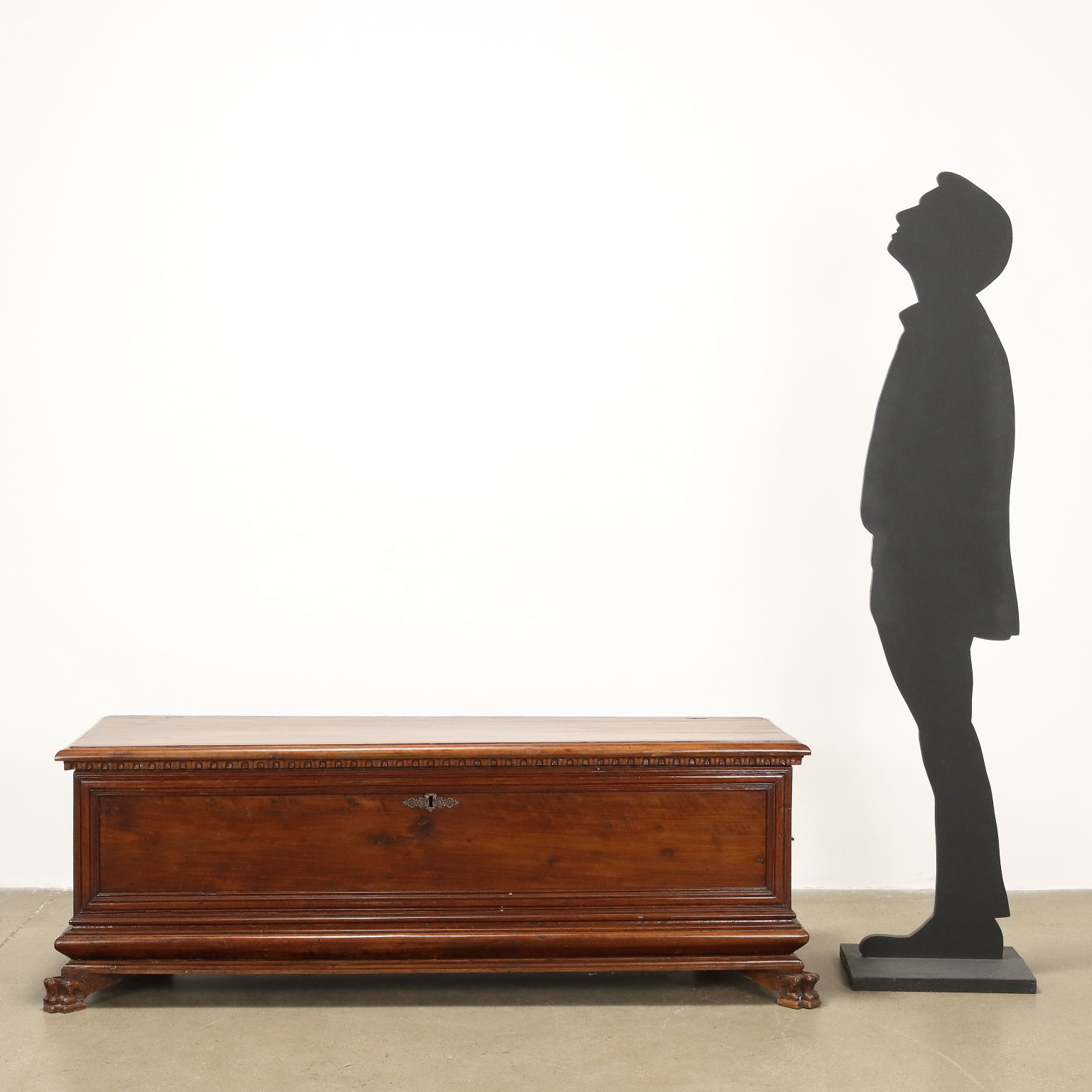 Chest in solid walnut, supported by lion feet. Side handles in wrought and chiseled iron., Restorations on the top. Italy, 18th century.