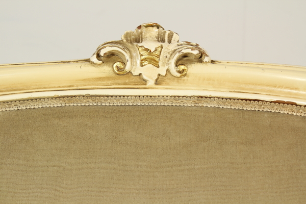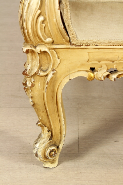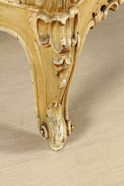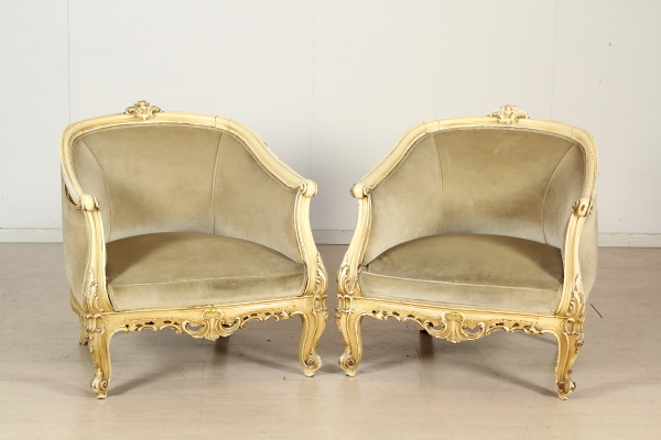 Armchairs with carved wooden part and move. Entirely lacquered in ivory with gold carvings. Backrest, padded armrests and seats.