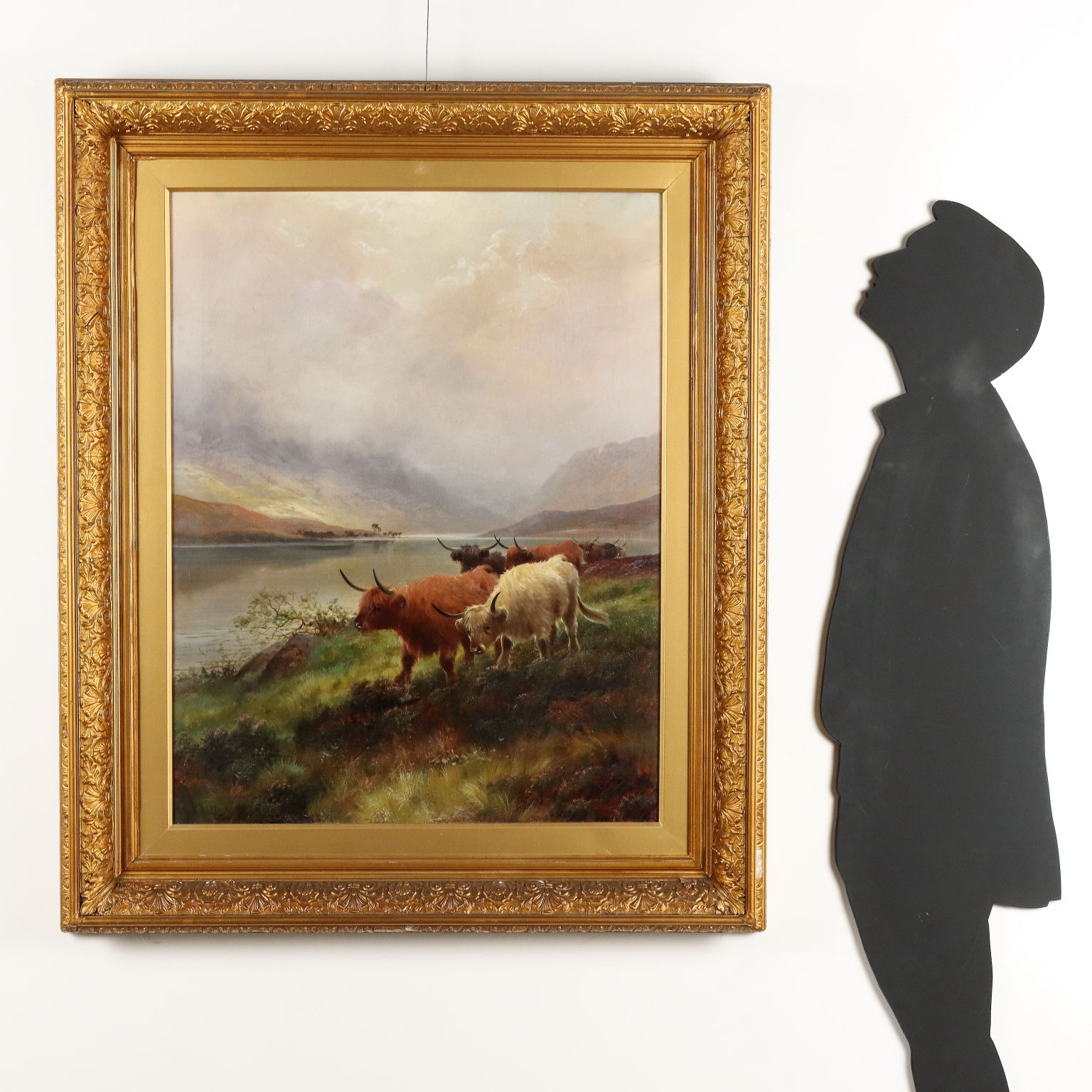 Oil on canvas. Signed lower left. Further signature and title on the back. A herd of Highland cows, a typical Scottish breed, is depicted on the shores of the Scottish lake Venachar. Henry Robinson Hall was an English artist who specialized in Victorian landscapes, and in particular glimpses of the Scottish countryside animated by herds of typical animals. The painting is presented in a gilded frame from the first half of the 20th century.