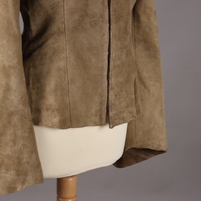 Jacket, lined, made of suede leather, with mandarin collar. Fastening with hidden metal hooks. The flared line of the sleeves is original, maintaining the natural and irregular shape of the leather remnant. The item is in very good condition, with only a few slight signs that do not preclude its use. Shoulder width: 39 cm. Height: 57 cm. Sleeve length: 68 cm max. The Ruffo company was founded in the 1960s and has always dealt with leather clothing, also producing for big names in fashion. The Research line, launched in 1998, was entrusted to emerging designers, who interpreted it with innovation and character.