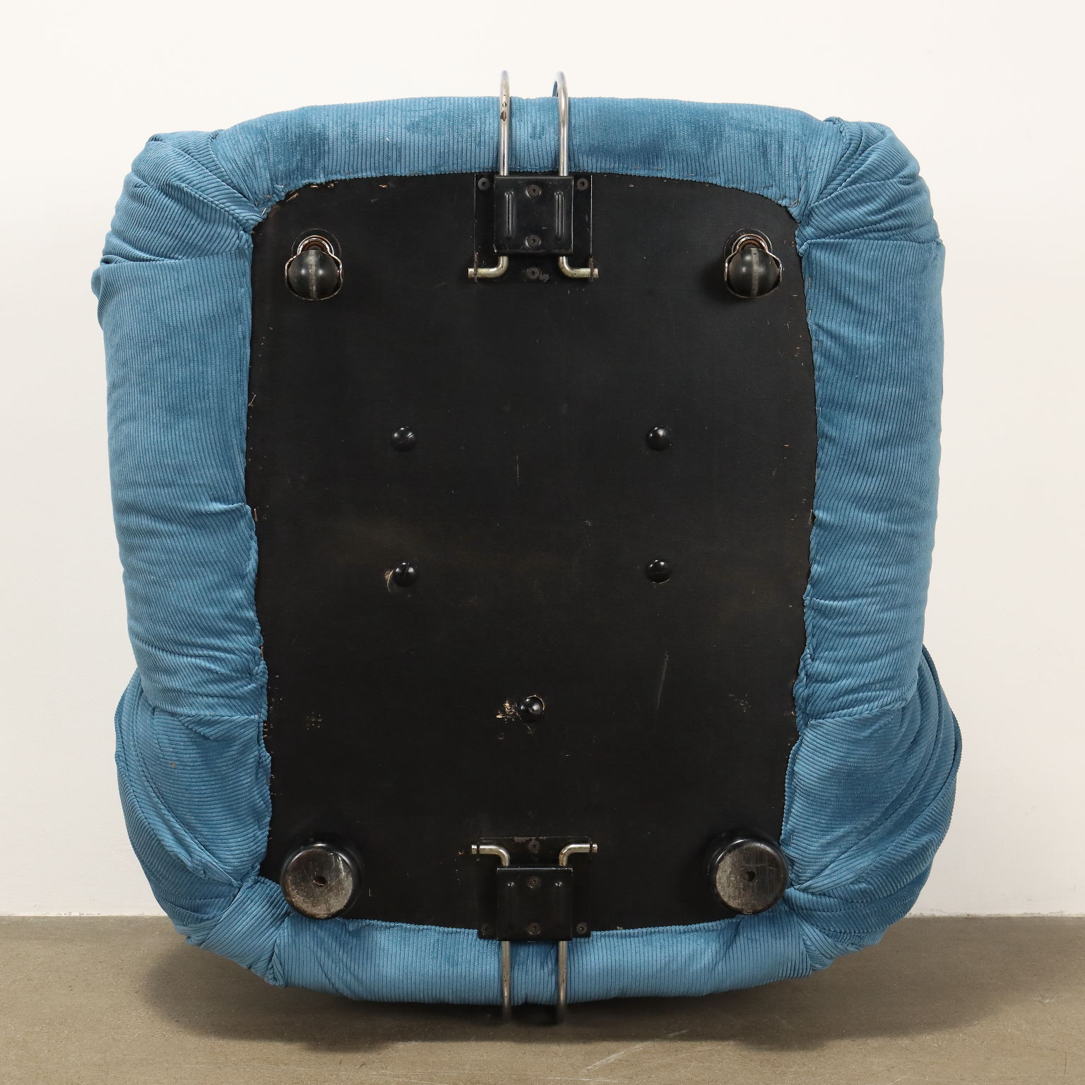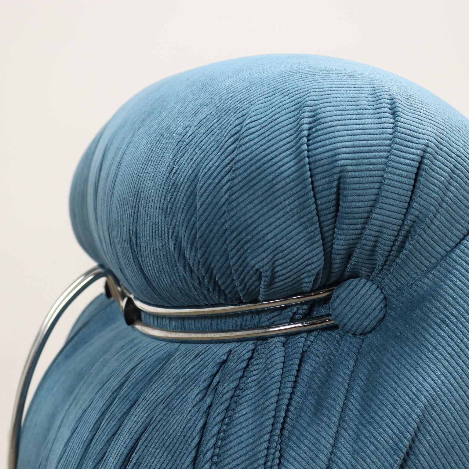Iconic pair of "Soriana" model armchairs, designed by Afra and Tobia Scarpa and produced by Cassina since 1970; Compasso d'Oro award in 1970. Foam padding, fabric upholstery (not original Cassina) visible chromed metal structure.