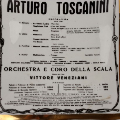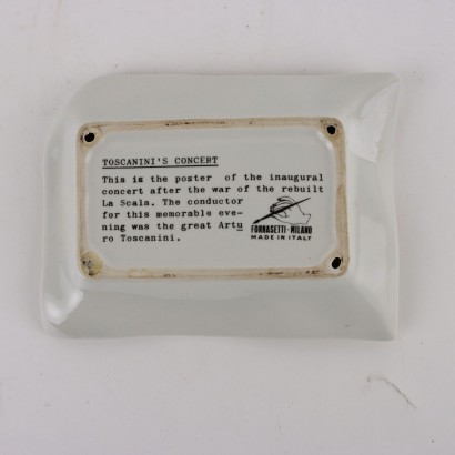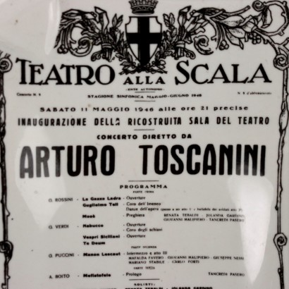 Gold-edged printed ceramic plate depicting the poster of the concert conducted by Arturo Toscanini at the Teatro alla Scala in Milan. Manufacturer's mark on the back.