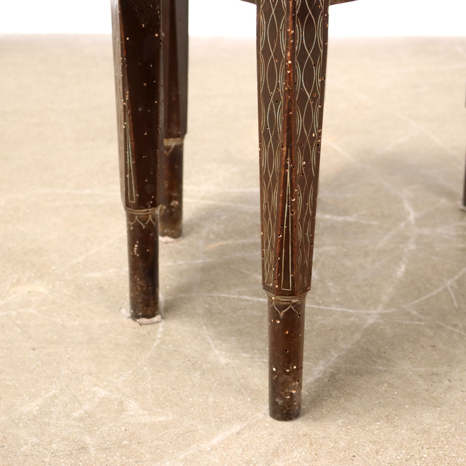 Armchair in the shape of a wraparound seat, made in the mid-19th century by the artist Galbiati Rino, decorative motifs over the entire surface, engraved and painted in green.