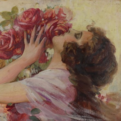 Oil on cardboard. Signed lower left. Tito Corbella established himself as a painter but above all as a poster artist, creating posters and postcards. In his production, female subjects prevail, elegant and romantic figures, created with delicate colors. The work is presented in a period frame.