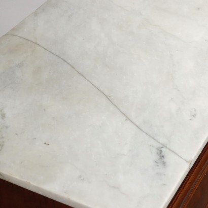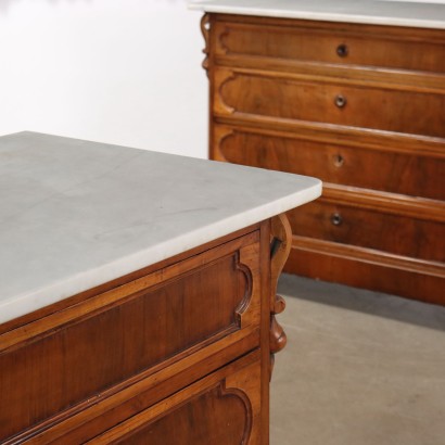 Pair of Louis Philippe walnut chests of drawers, four drawer front, white Carrara marble tops, onion-shaped feet. Cherry interiors, missing keyholes and keys, Italy, second quarter of the 19th century.
