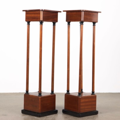 Pair of vase holders from the early 20th century, made with a pedestal on which rest four columns that support a top. Made of mahogany with ebonized parts.