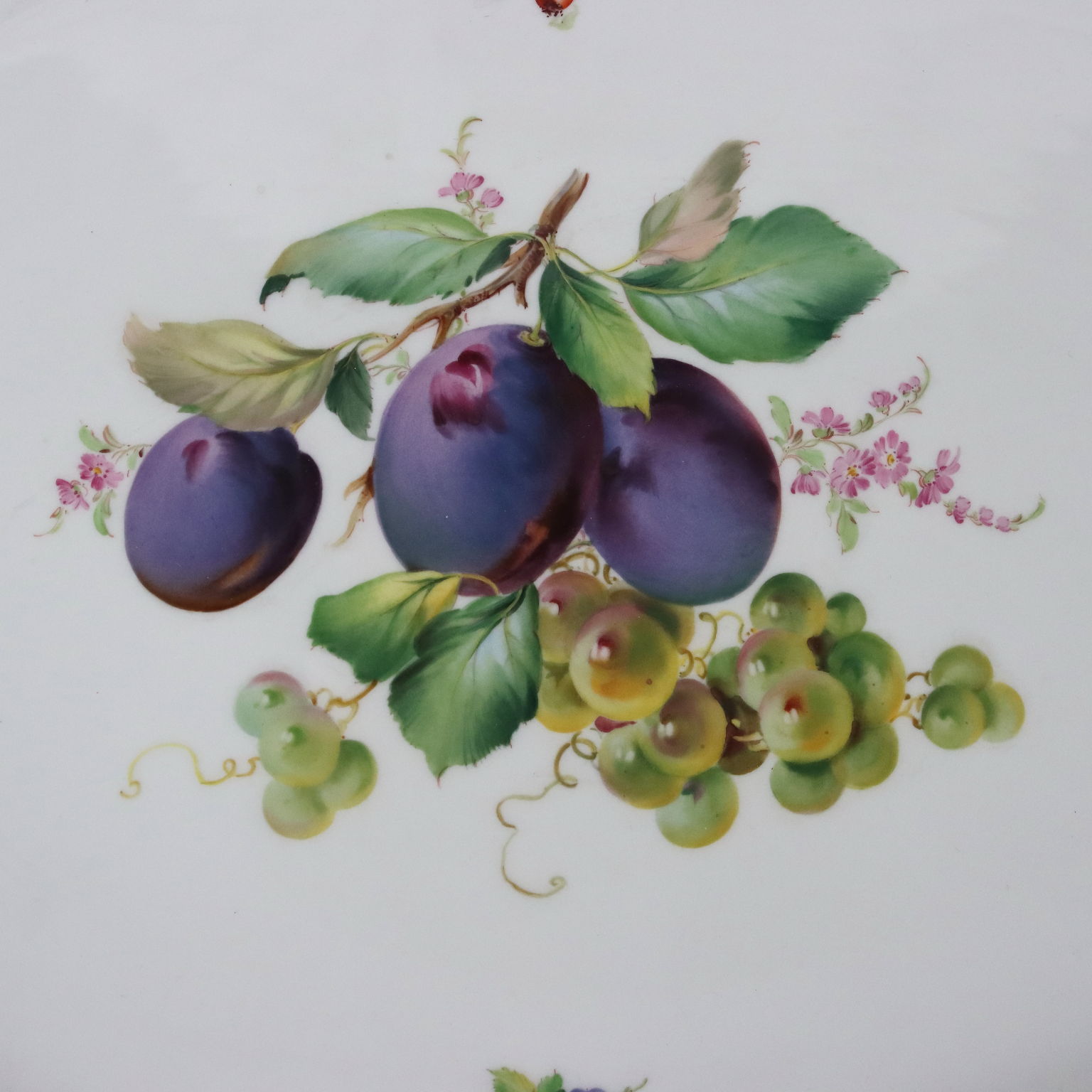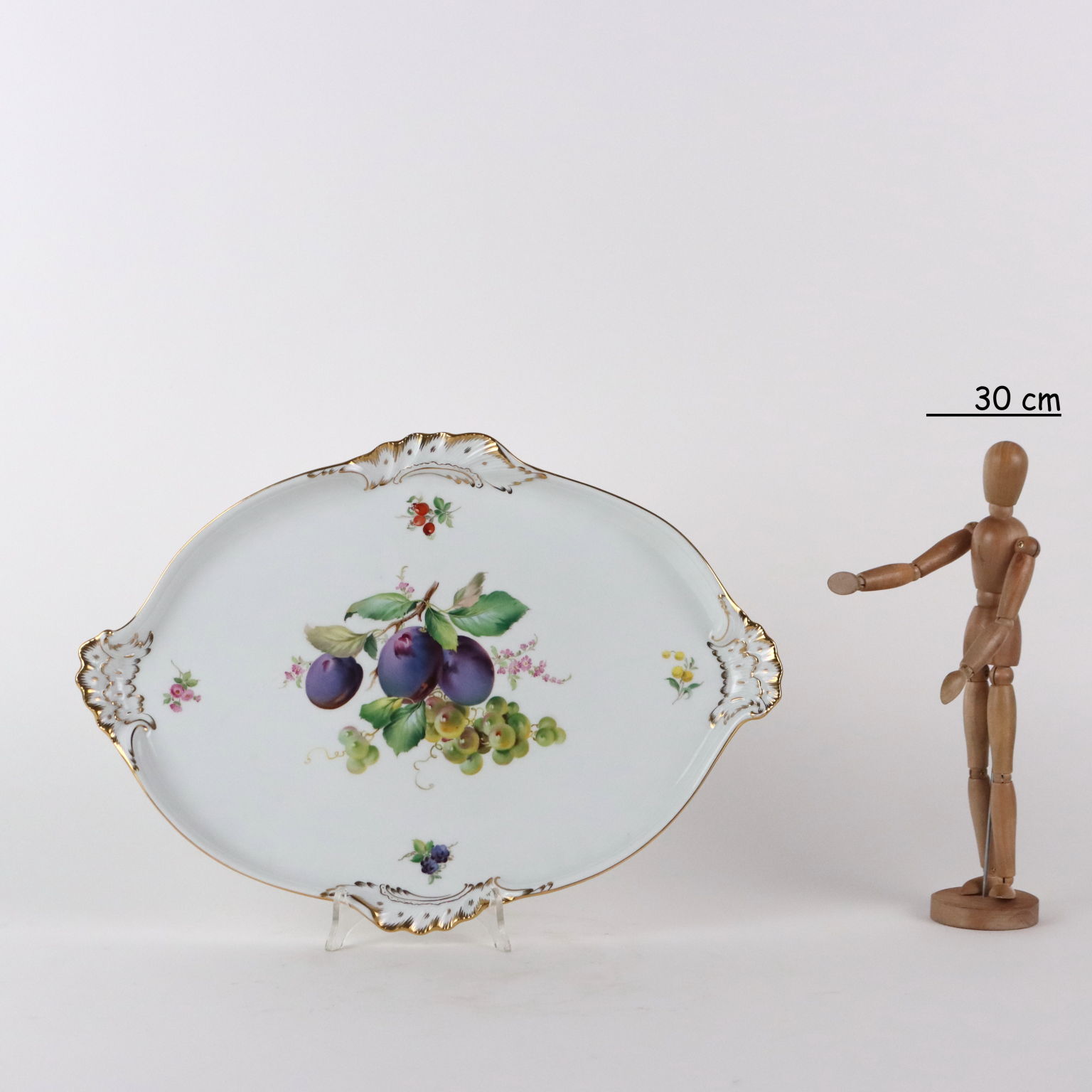 White porcelain tray with polychrome decorations of flowers and fruit, gold highlights on the edge. Under the base, the manufacturer's mark.