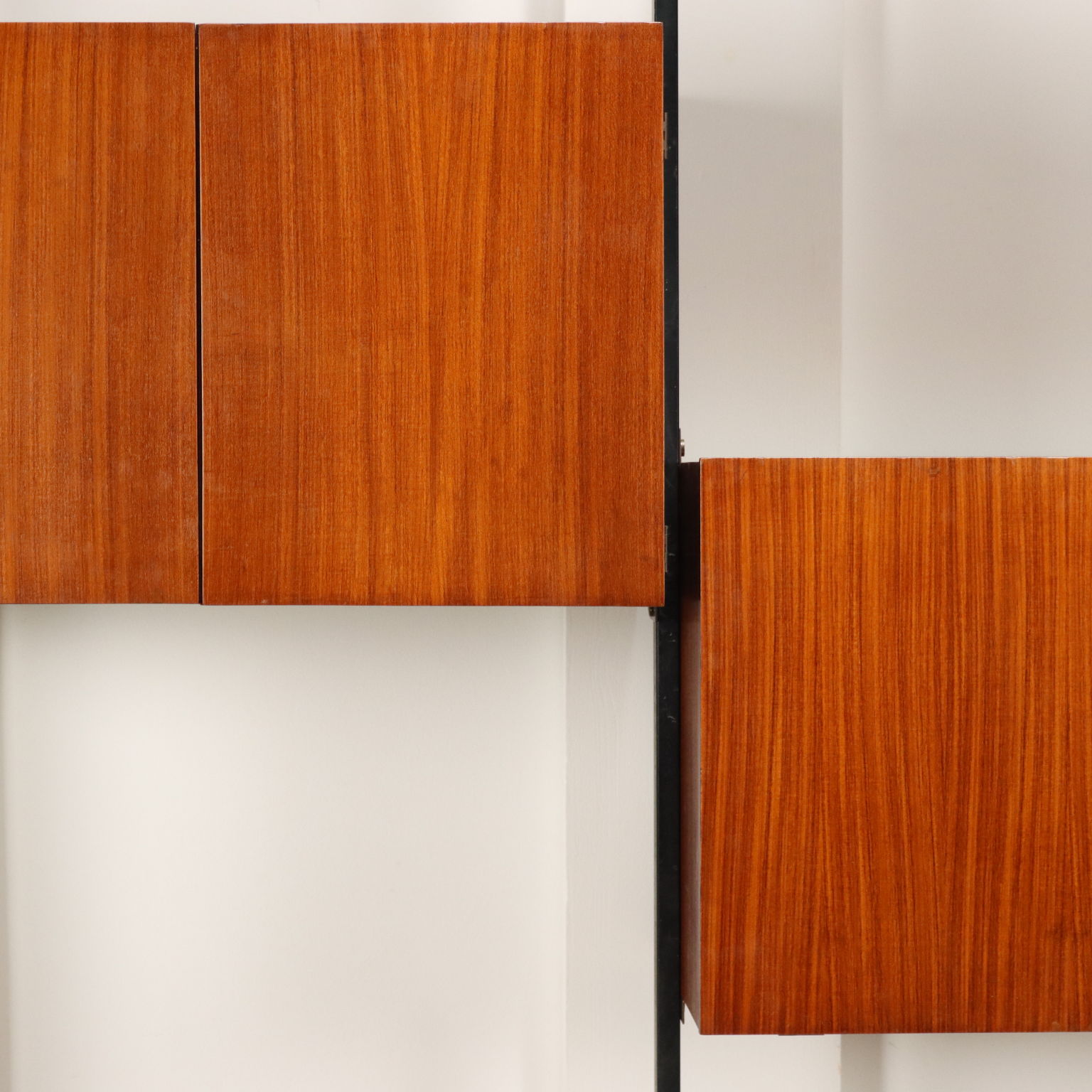 Center-to-ceiling bookcase, with adjustable-position storage elements and shelves, hinged openings, flap and visible drawers, teak veneer, enameled metal uprights with brass terminals. Completely restored.