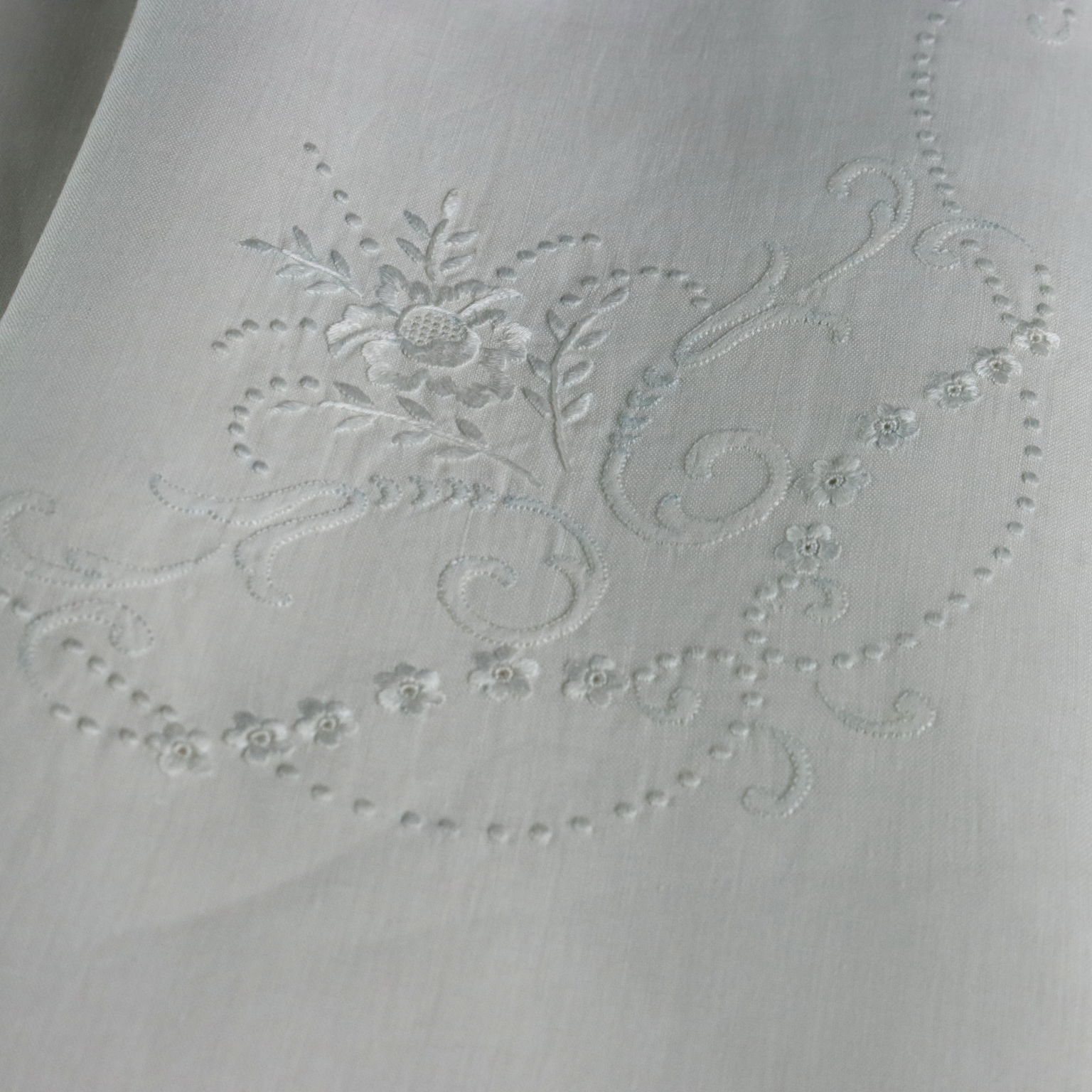 Double bed linen set Elegant and refined, the reversina is entirely embroidered in shadow stitch and satin stitch which gives relief to the embroidery. The two pillowcases close with button fastening. White colour. Composition: linen. Dimensions: Sheet: 272 cm x 230 cm. Pillowcases: 81 cm x 51 cm.