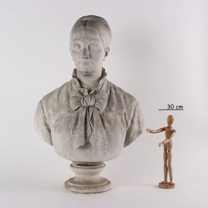 Female bust in plaster made in the last decades of the 19th century, presents breaks and missing parts.