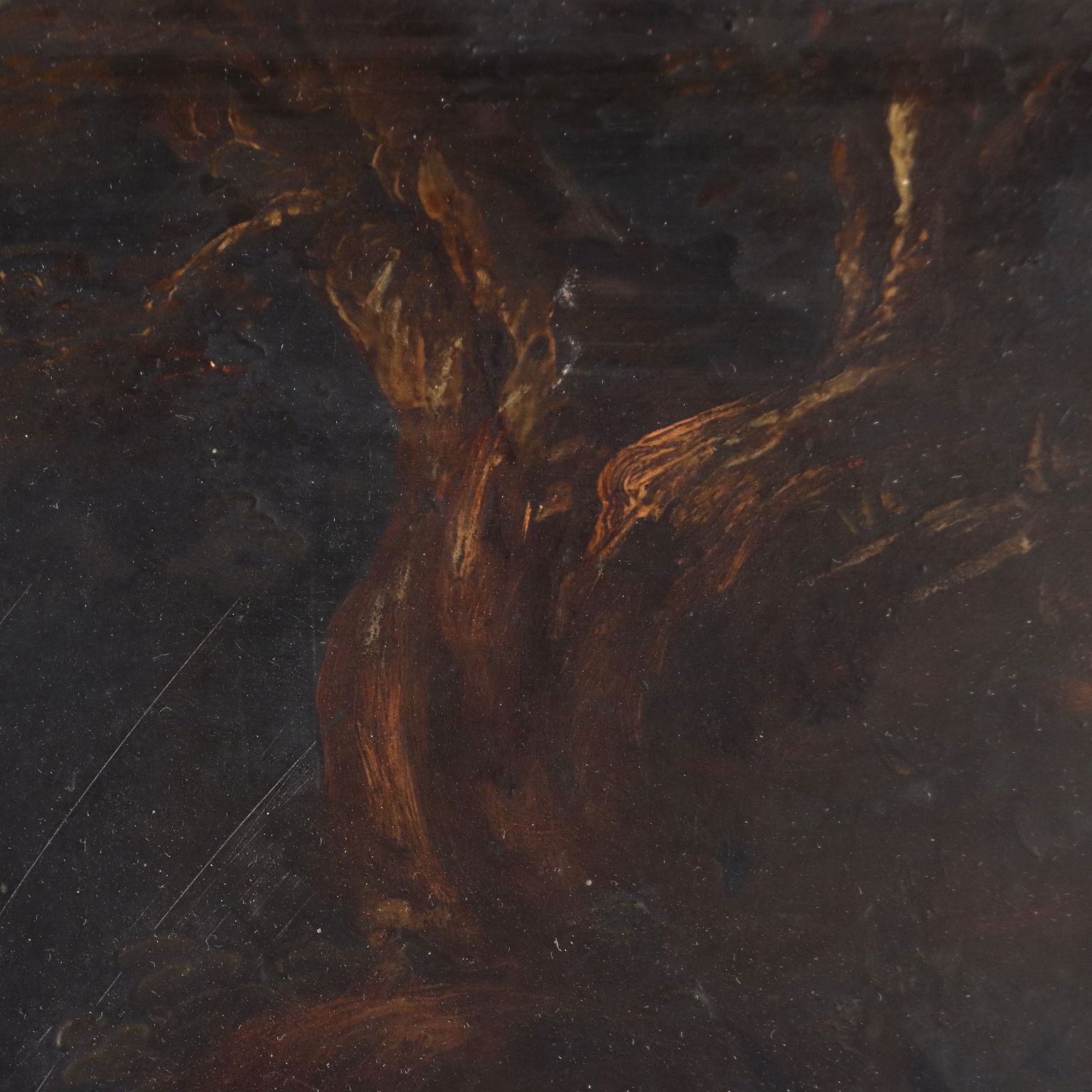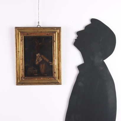 Oil on slate. The old hermit is kneeling in contemplation of the Crucifix, resting on some stones, preparing to eat the Eucharistic bread he holds in his hand. At the top left a crow flies in, holding a loaf of bread in its beak. It is probably Paul of Thebes, remembered as Paul the First Hermit (Egypt, around 230 – Thebaid, around 335), considered by Christian tradition to be the first hermit. He is venerated as a saint by the Catholic, Orthodox and Coptic Churches. According to legend, having retired to the mountains of the Thebaid desert to escape Roman persecution, he received a daily visit from a crow that brought him bread. The painting is presented in an ancient frame.