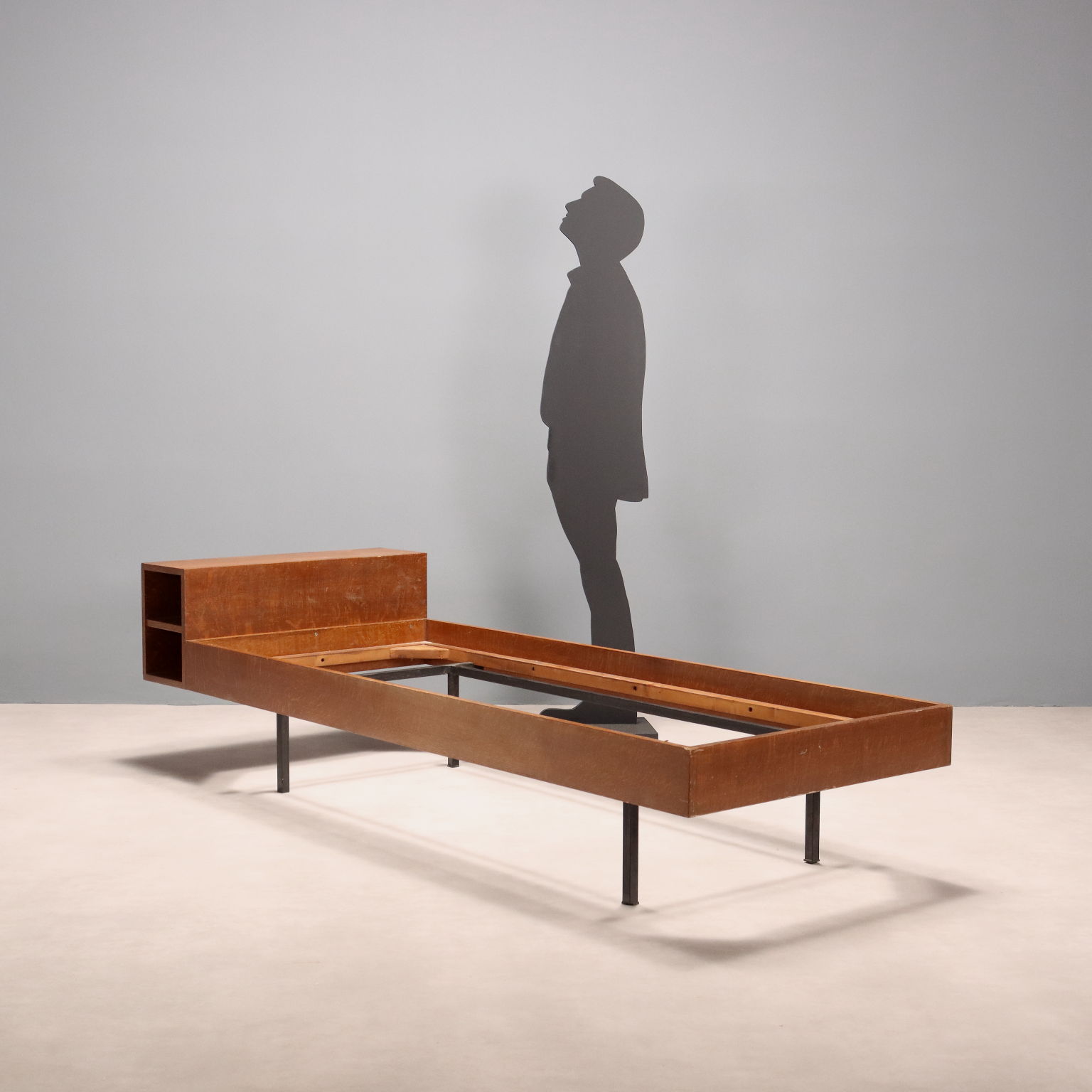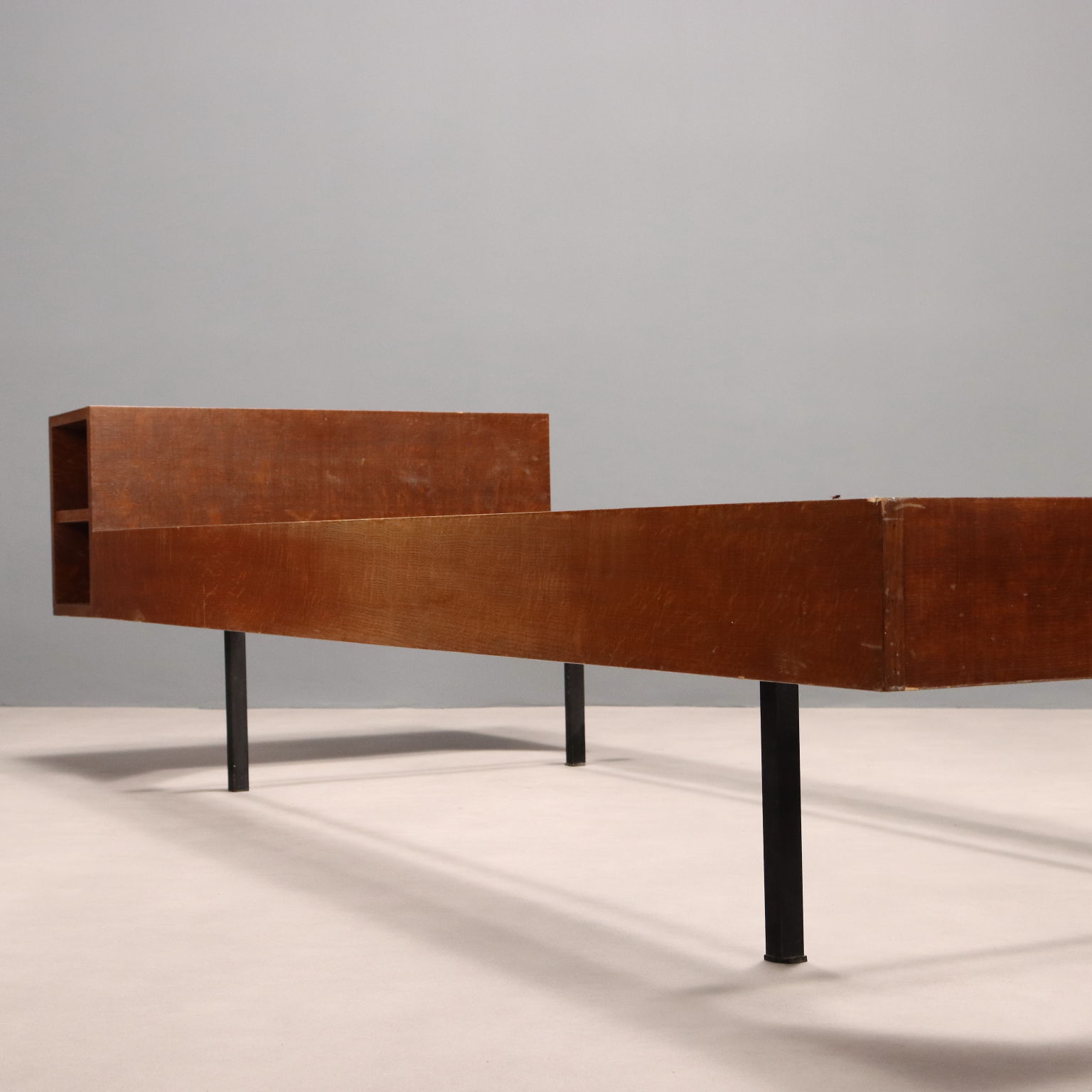 Single bed with open compartment, teak veneer, enamelled metal legs.