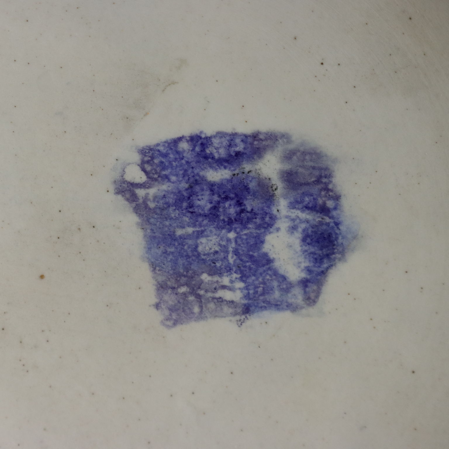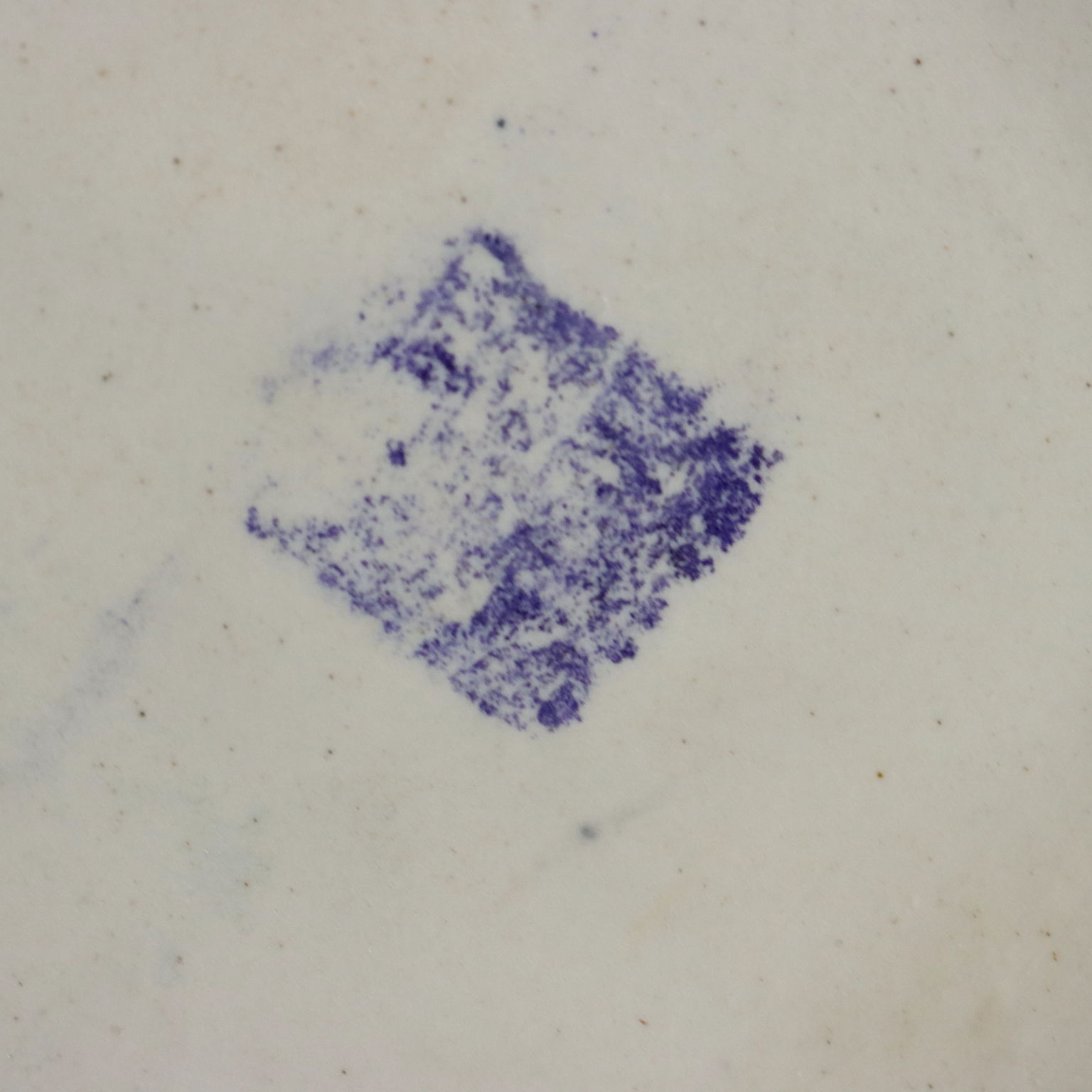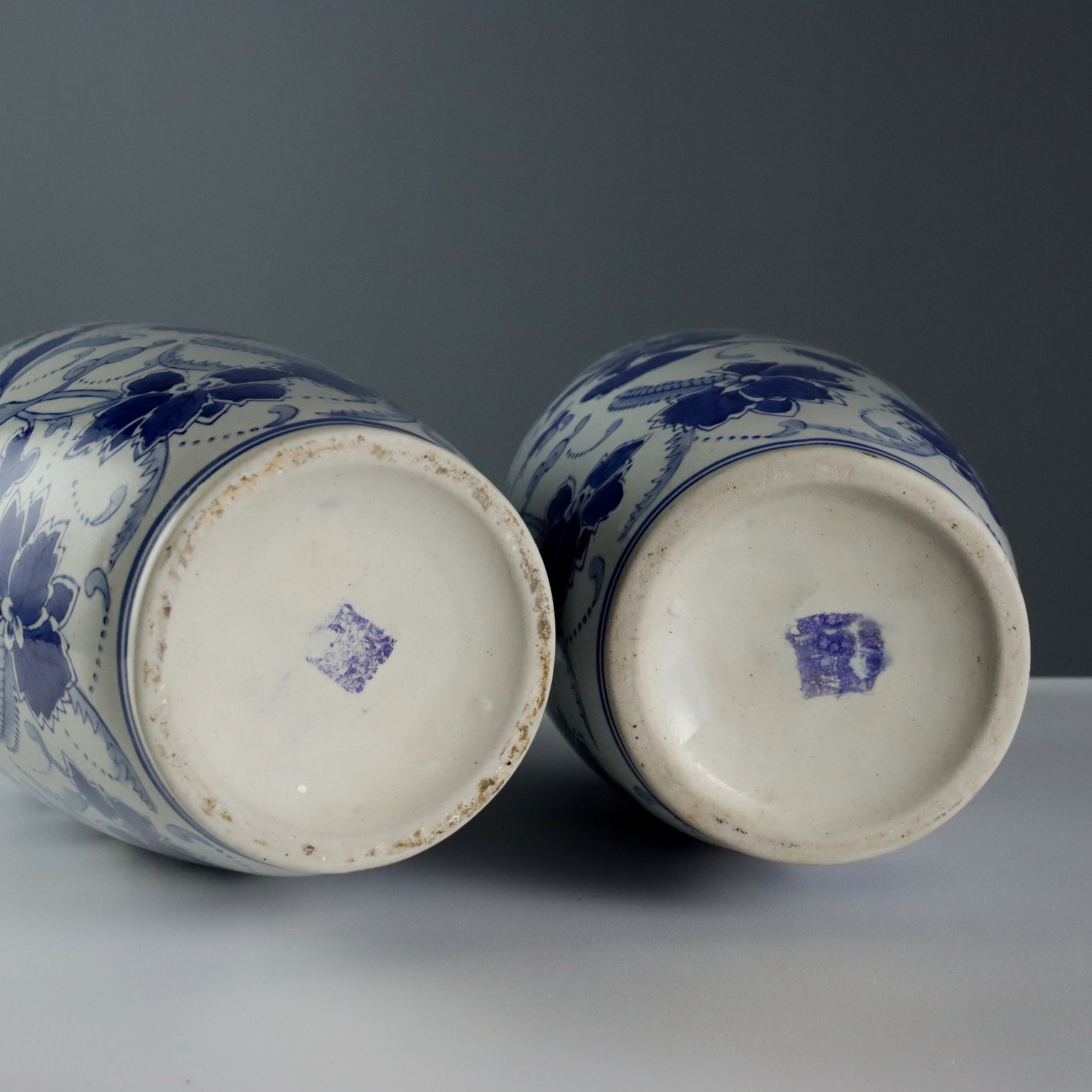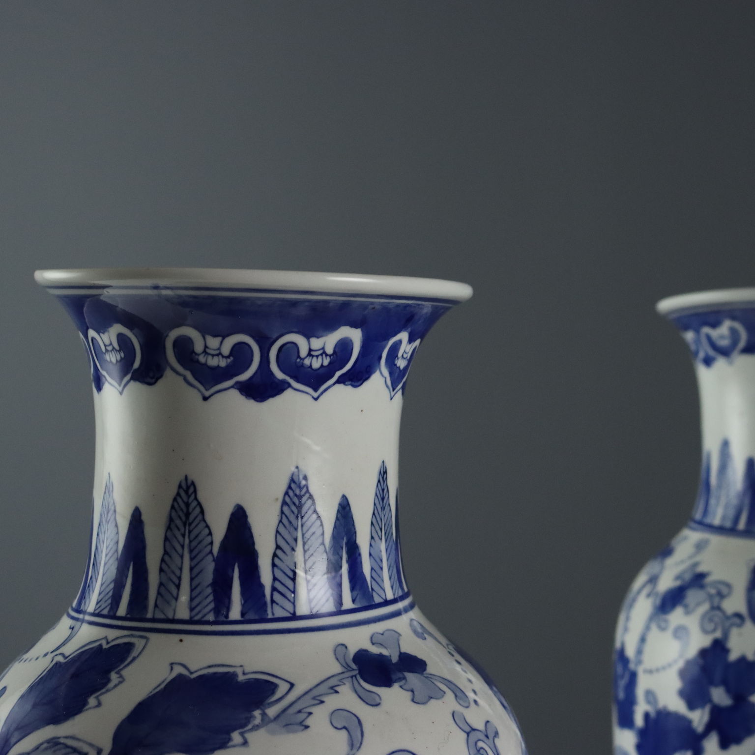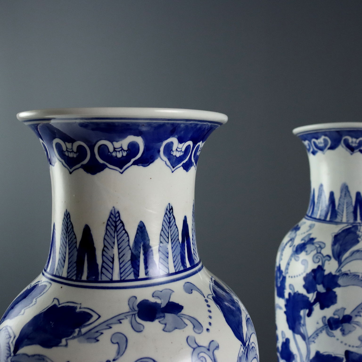 Antique vases with decoration in shades of blue depicting flower shoots and leaves. Neck decorated with a motif of stylised leaves and Greek frets. Brand under the base.