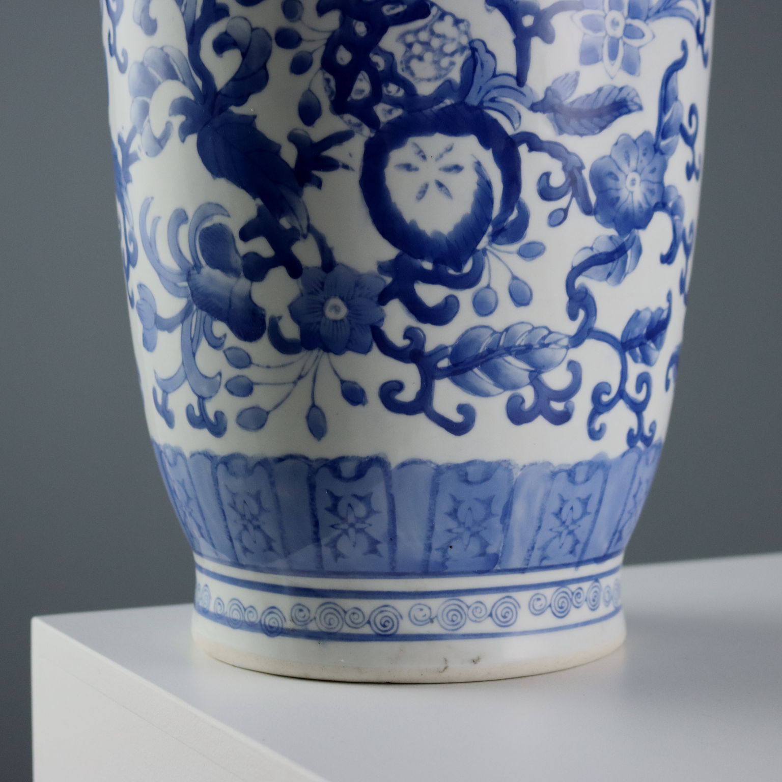 Porcelain vase with all-over decoration in shades of blue depicting flower shoots, leaves and pomegranates. Neck and base embellished with Greek frets.