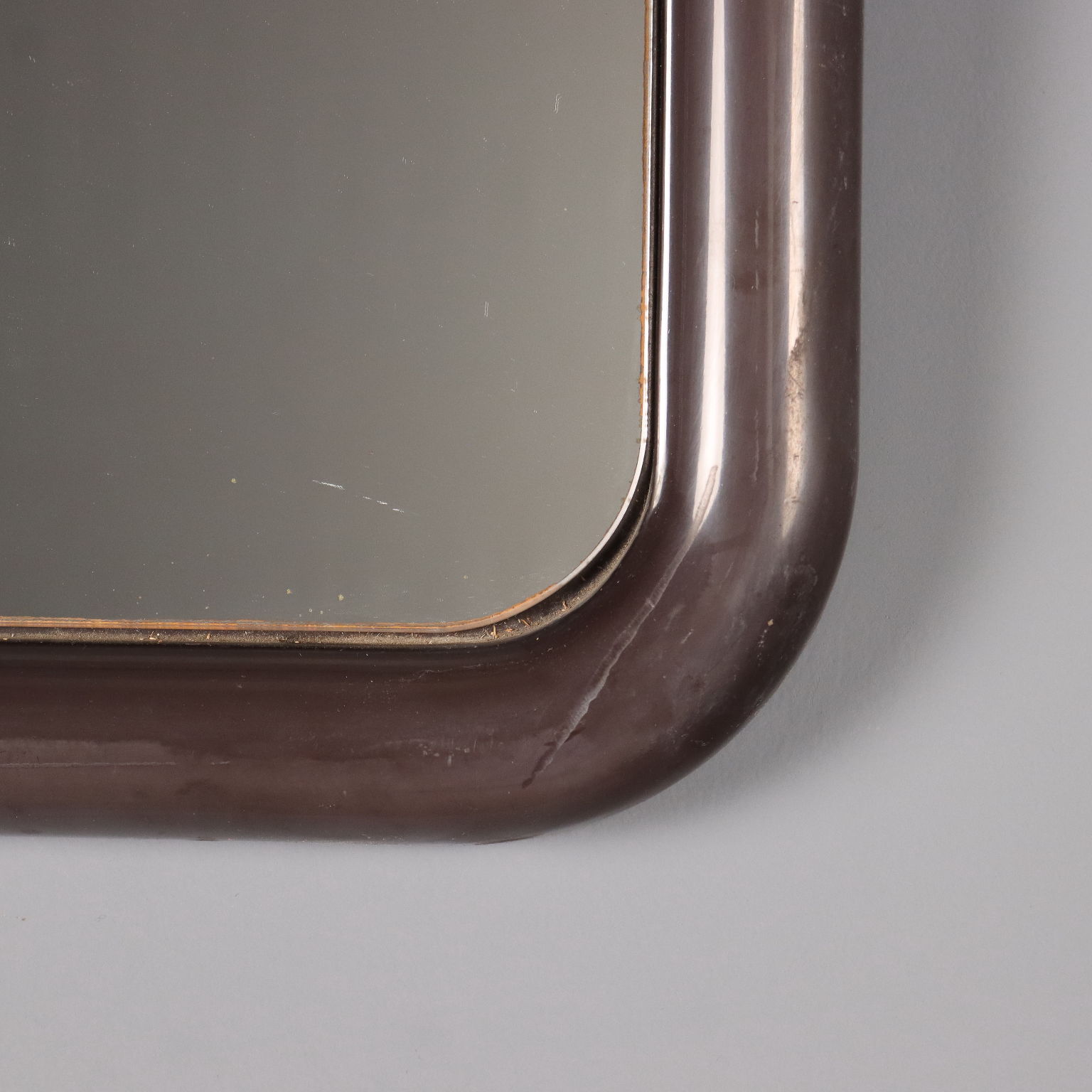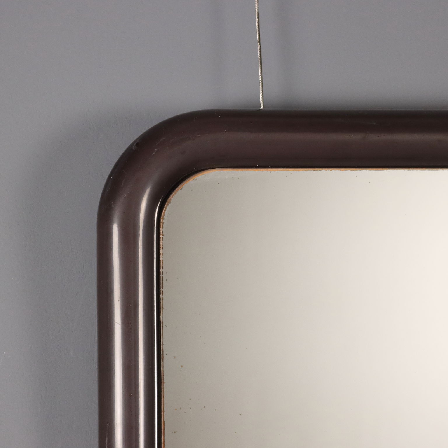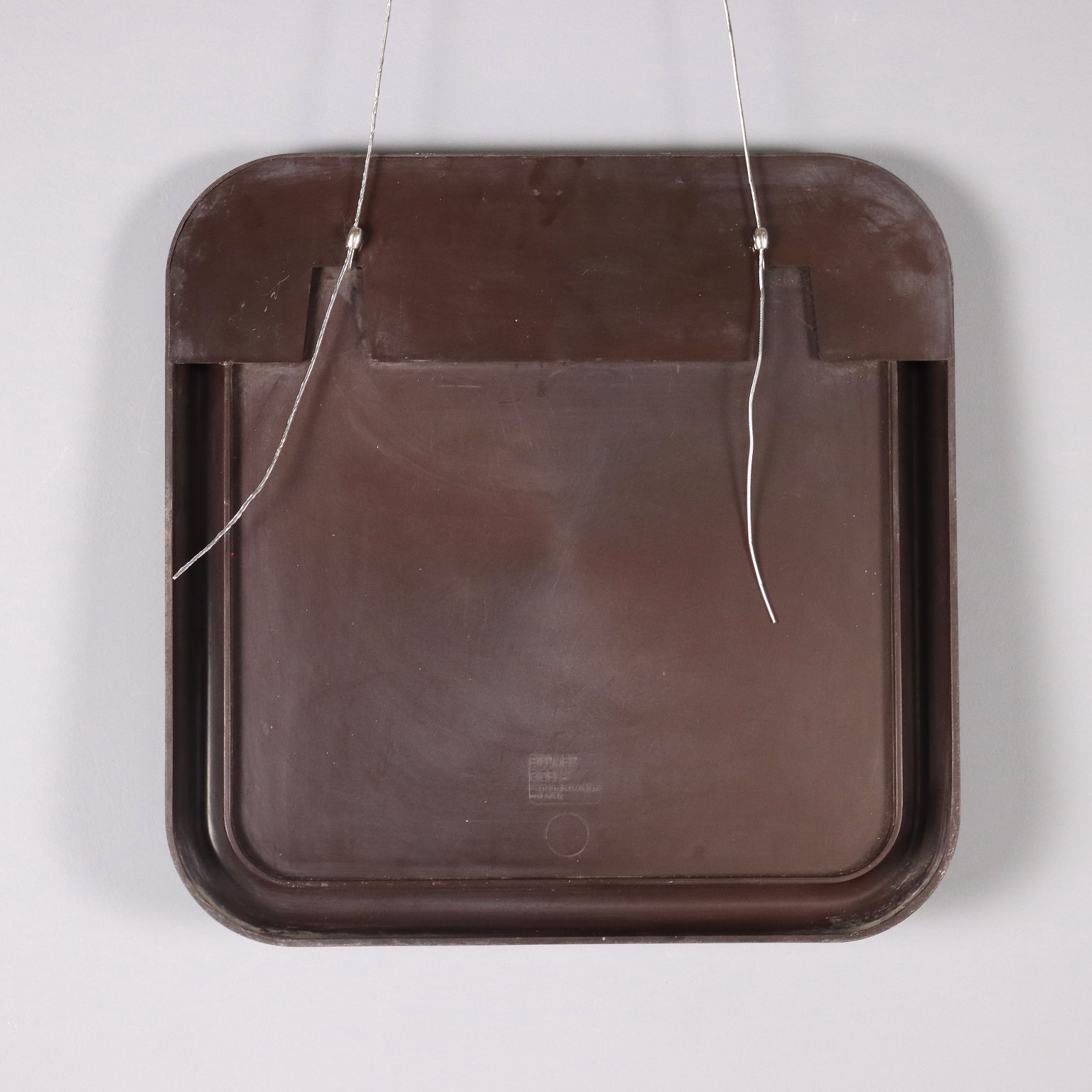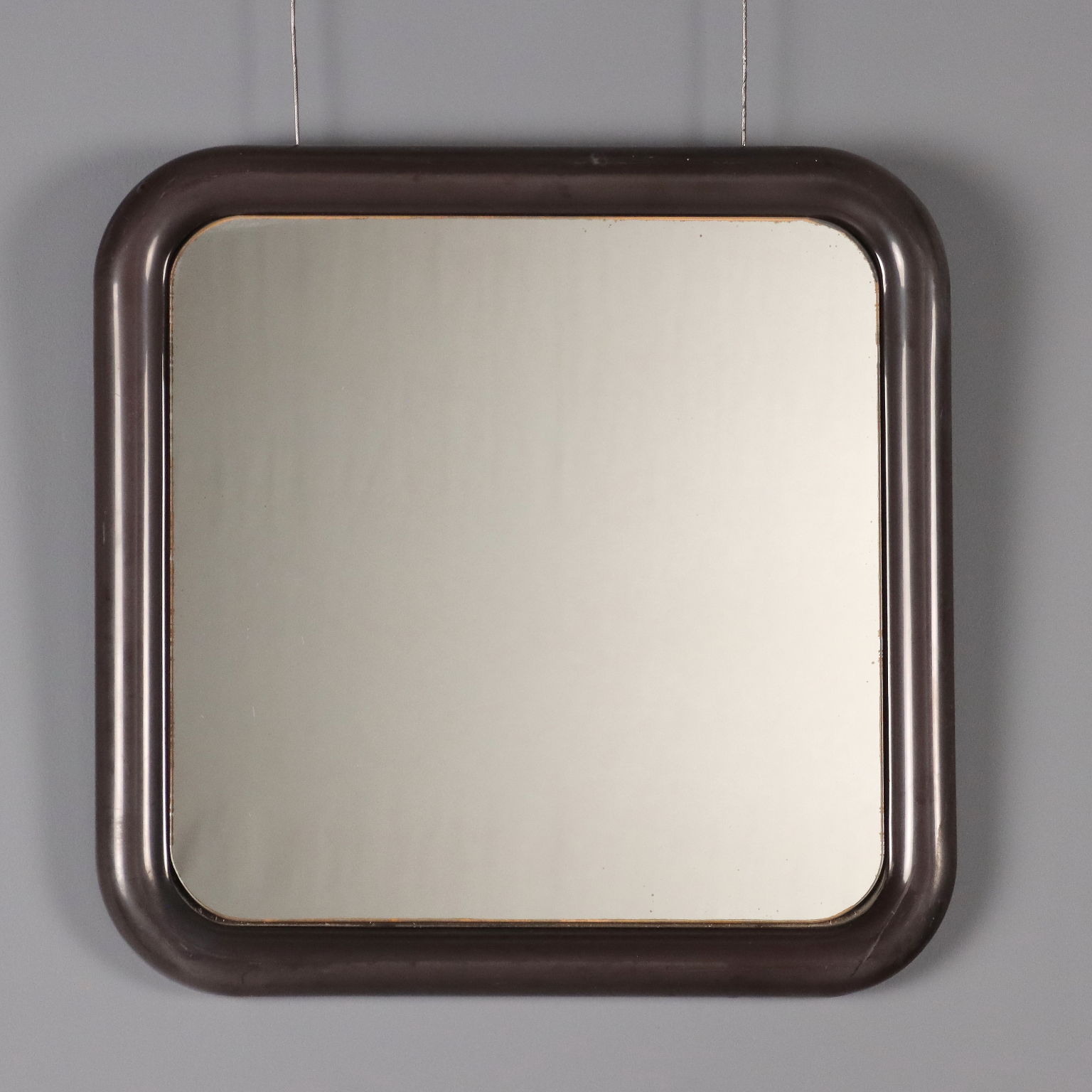 Vintage 1970s square mirror with beveled corners and brown plastic frame.