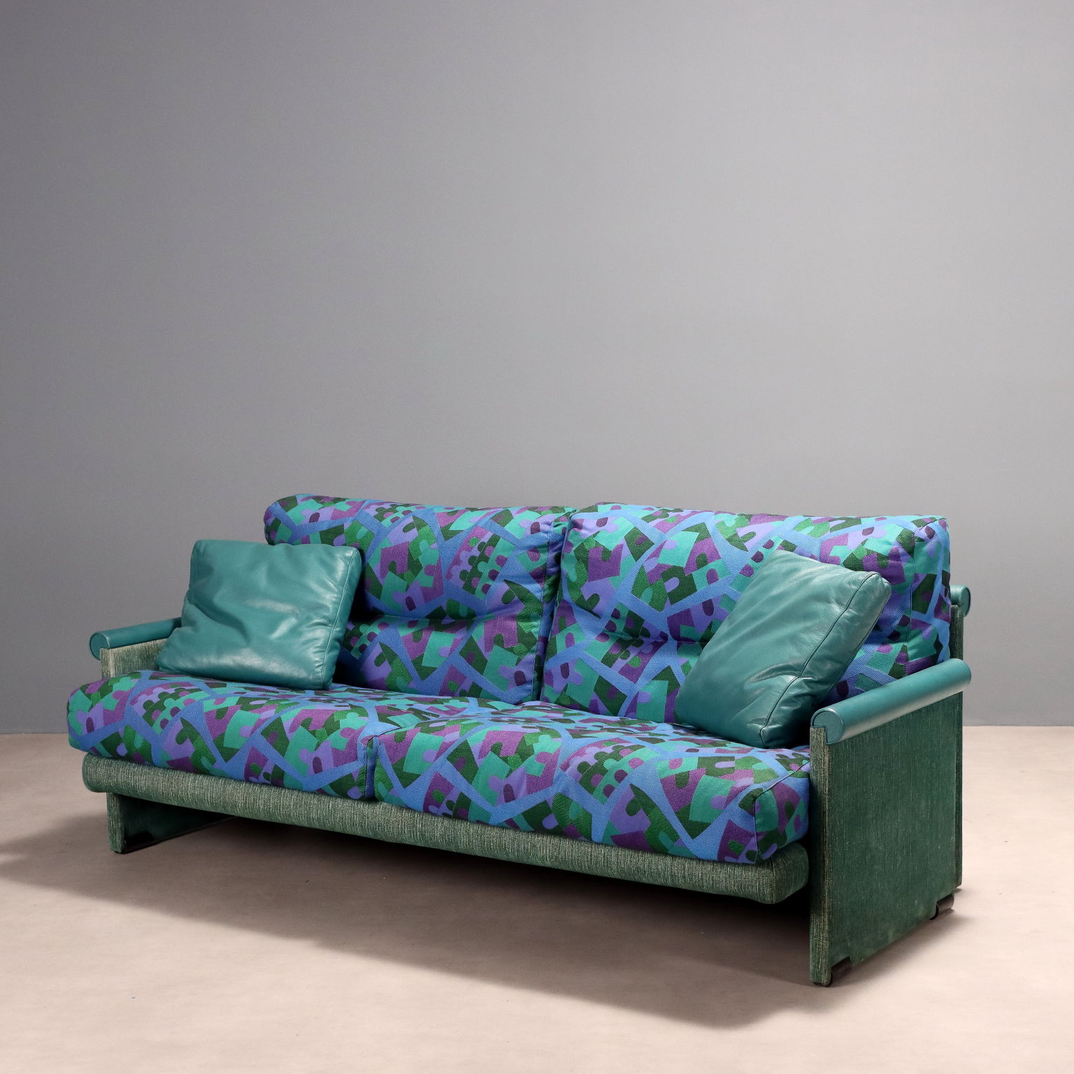 Vintage 2 Seater Sofa Fabric Leather Design Italy 1980s