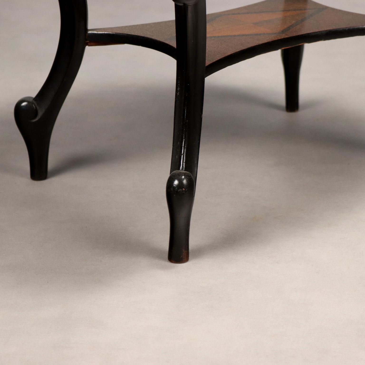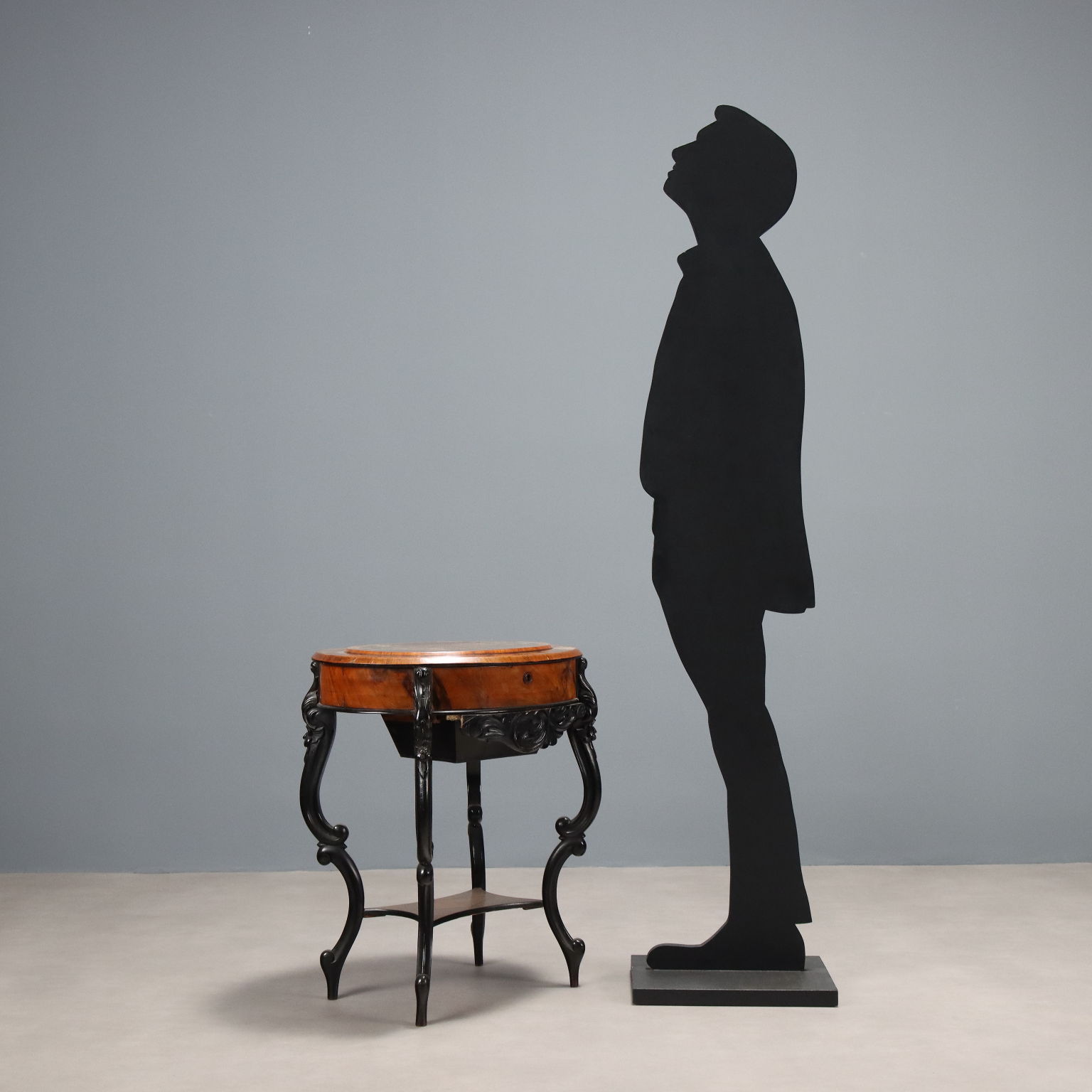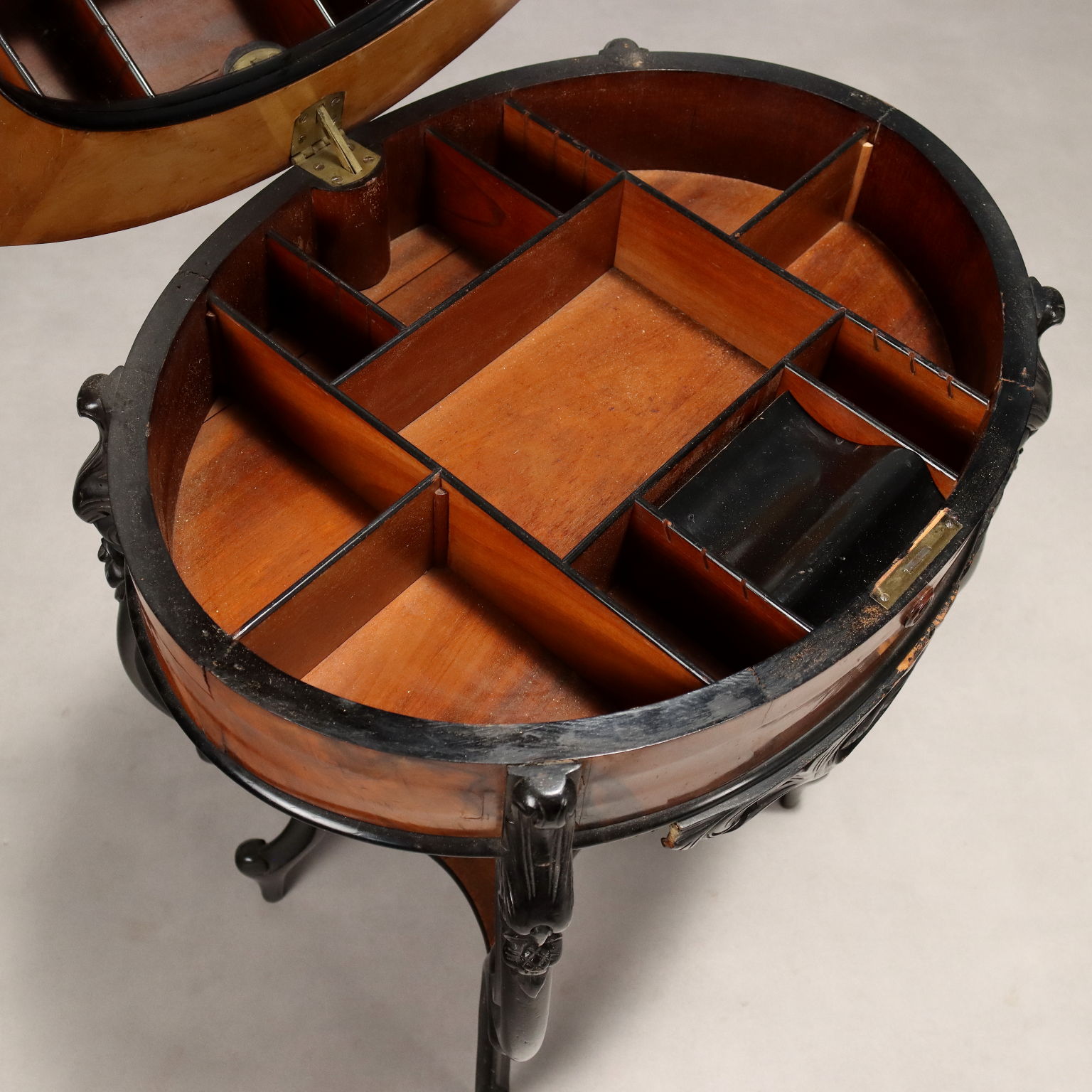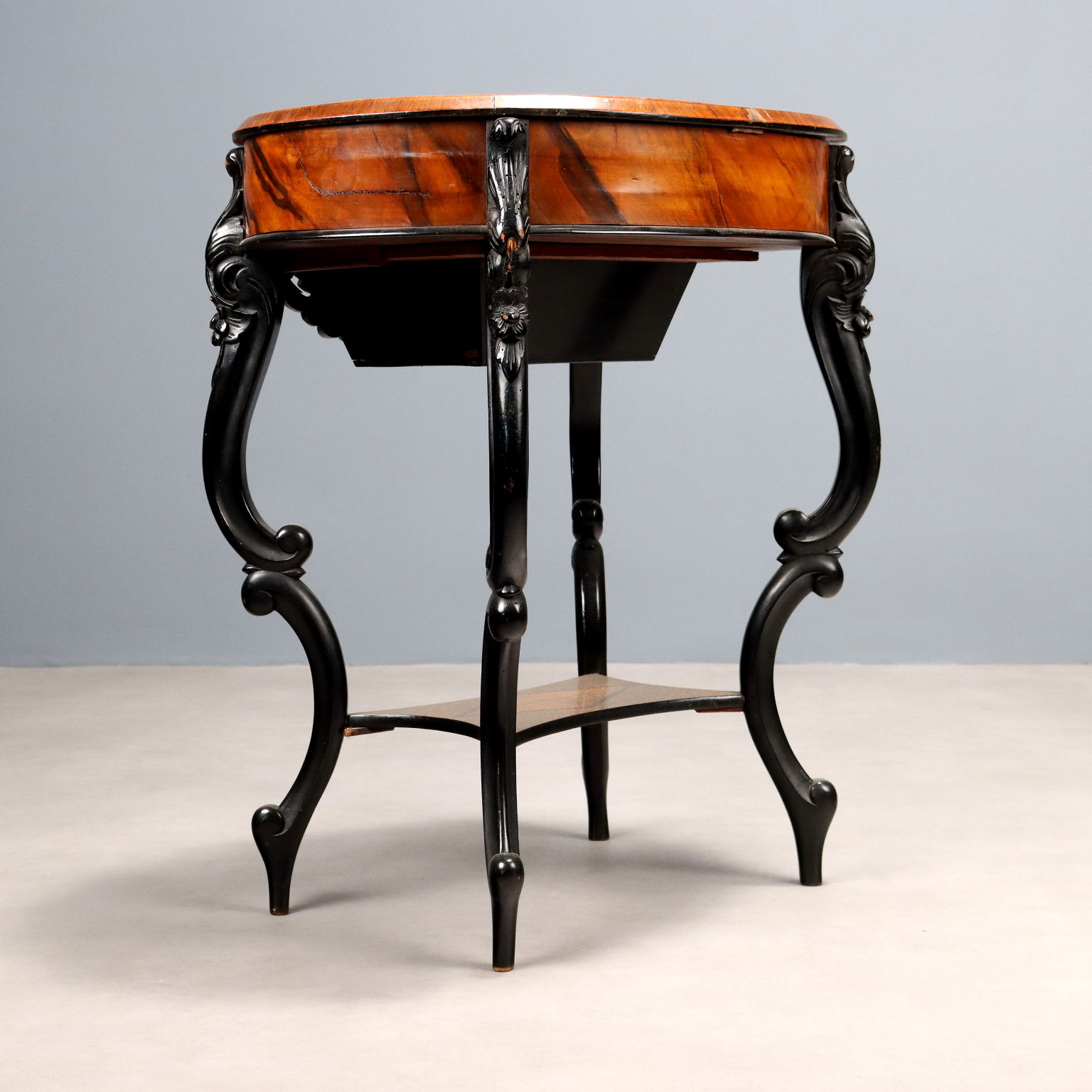 Louis Philippe oval table. Walnut and crotchet veneer, drop-leaf top inlaid with floral and leaf motifs and a mirror behind it, interior with open compartments and closed compartments in mahogany and poplar. Slender legs, carved with scrolls and flowers, are ebonized, as is the apron that serves as a pull for the drawer under the top. Italy, mid-19th century.