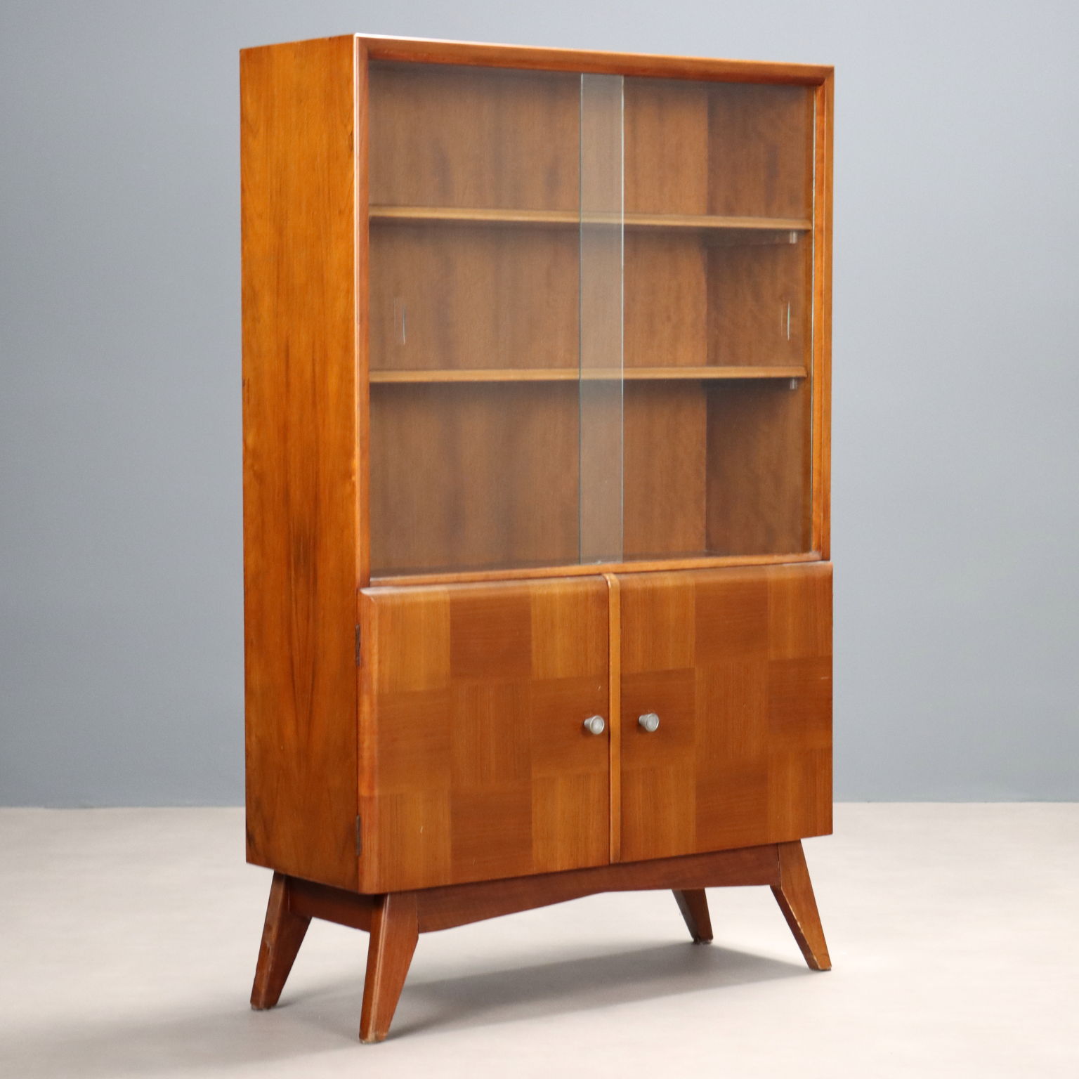Display cabinet with hinged doors at the bottom and sliding glass doors at the top. Walnut veneer. Good condition.