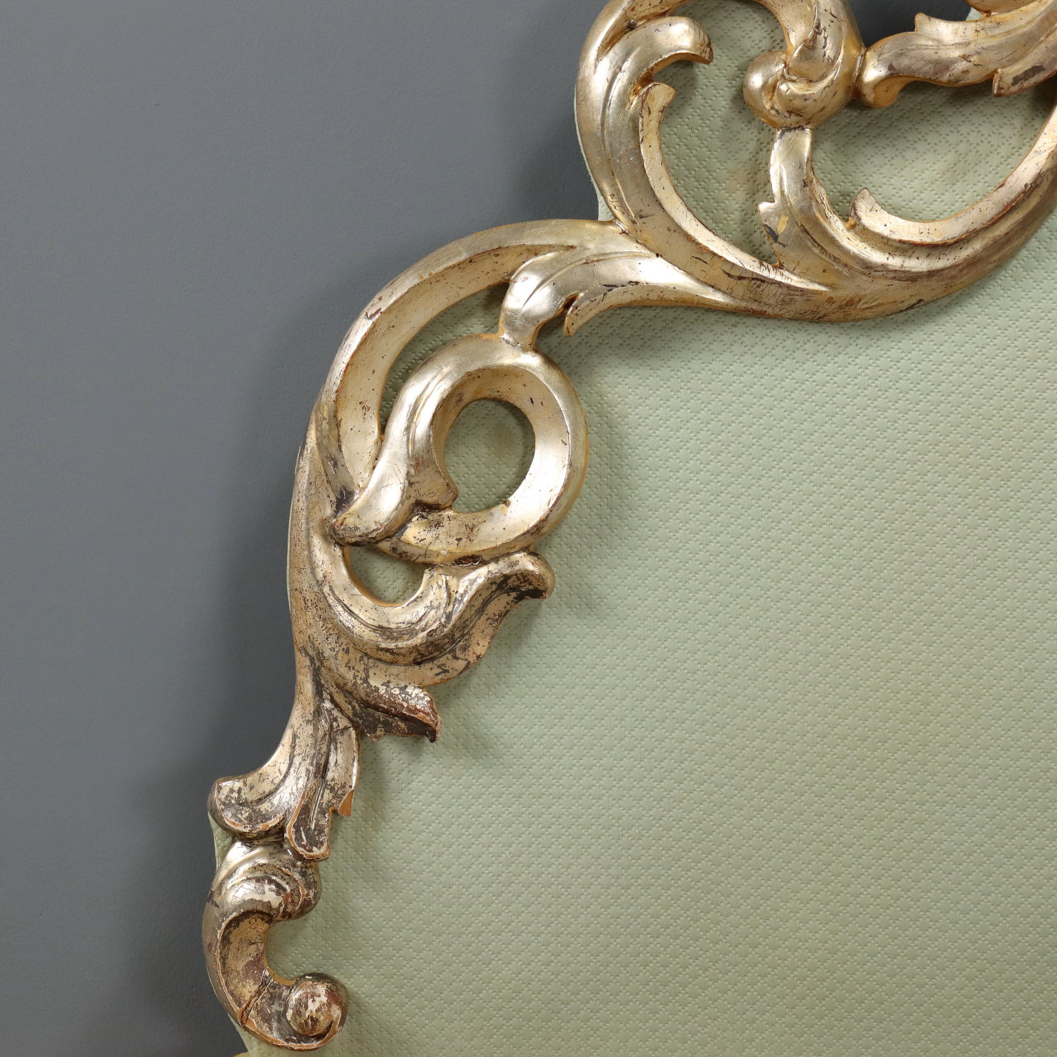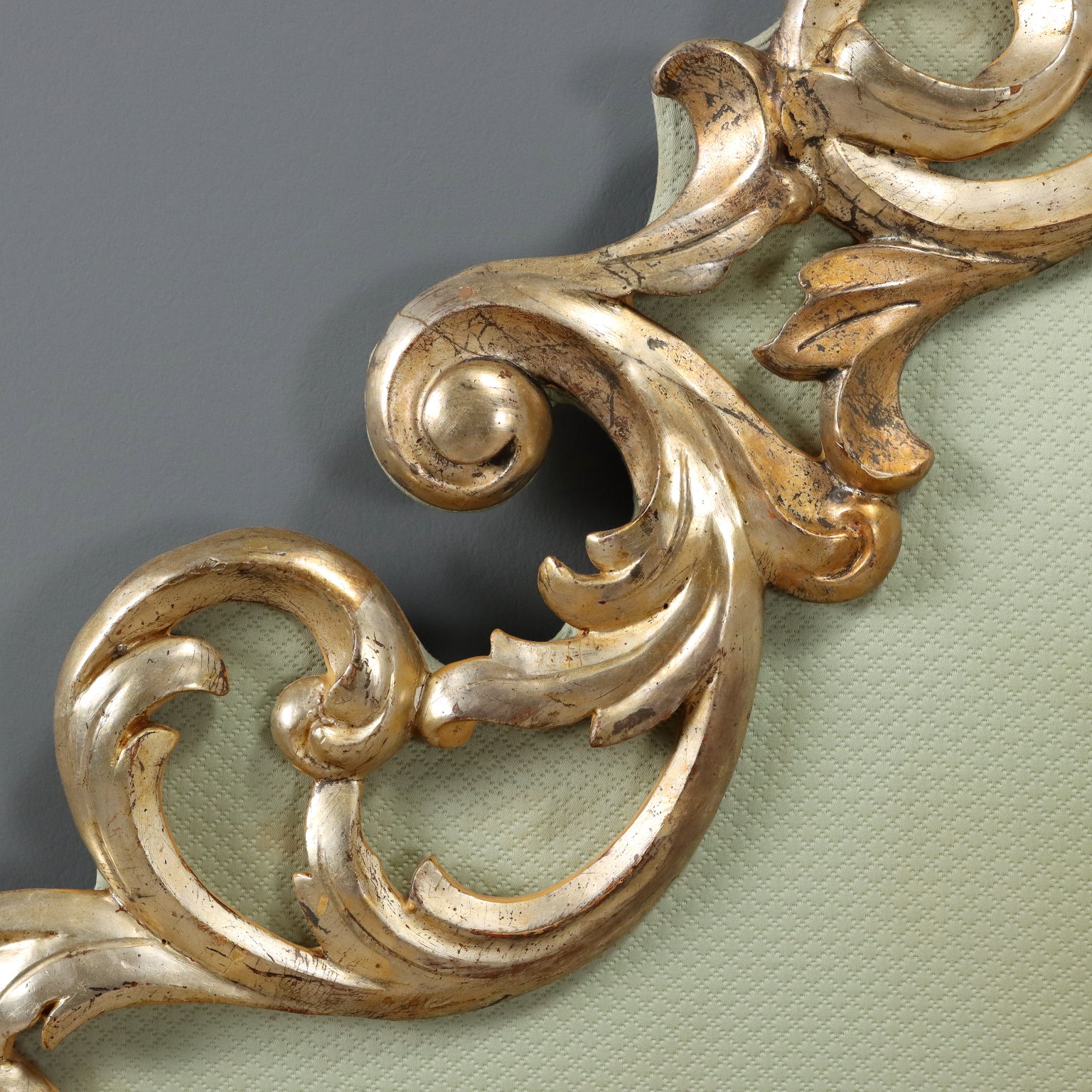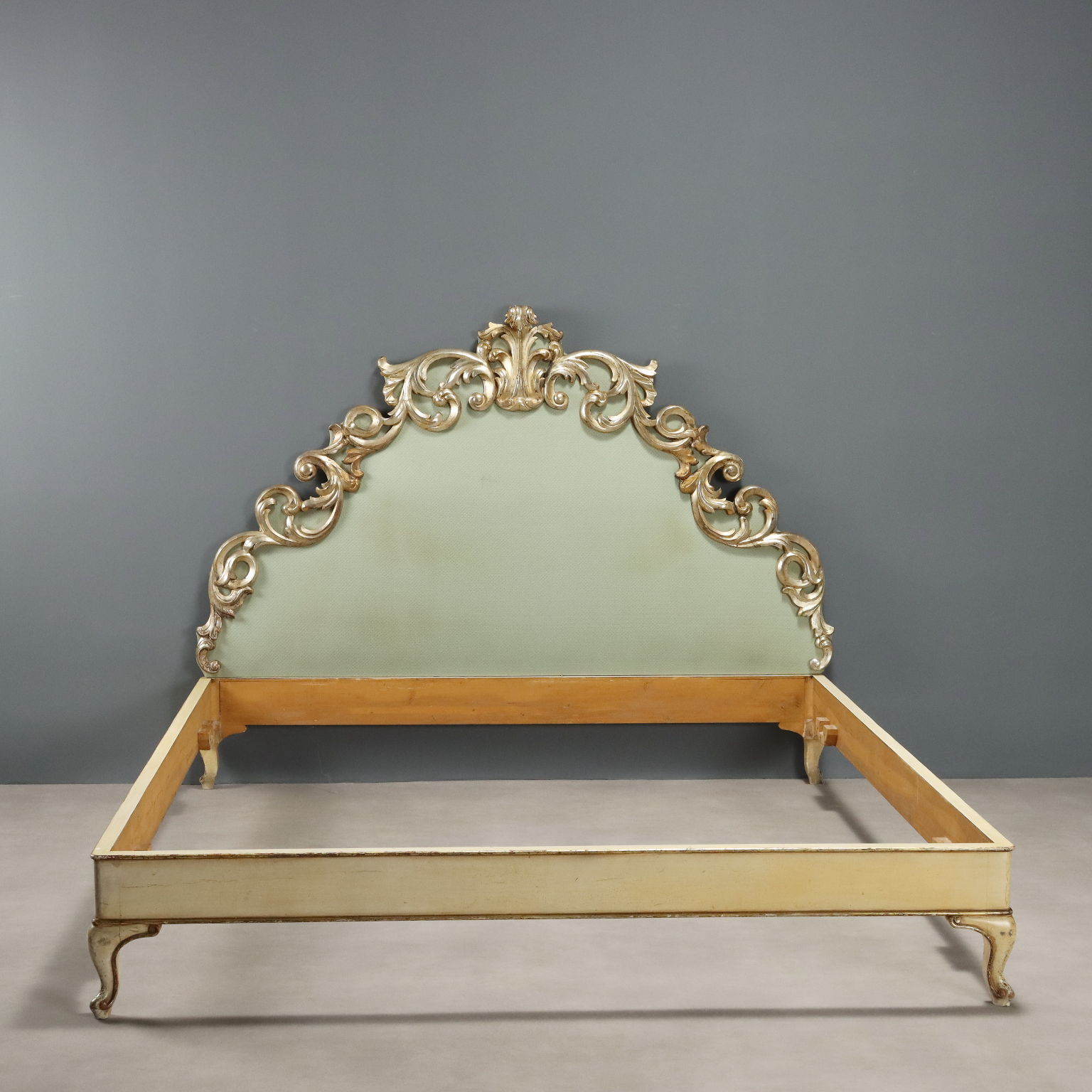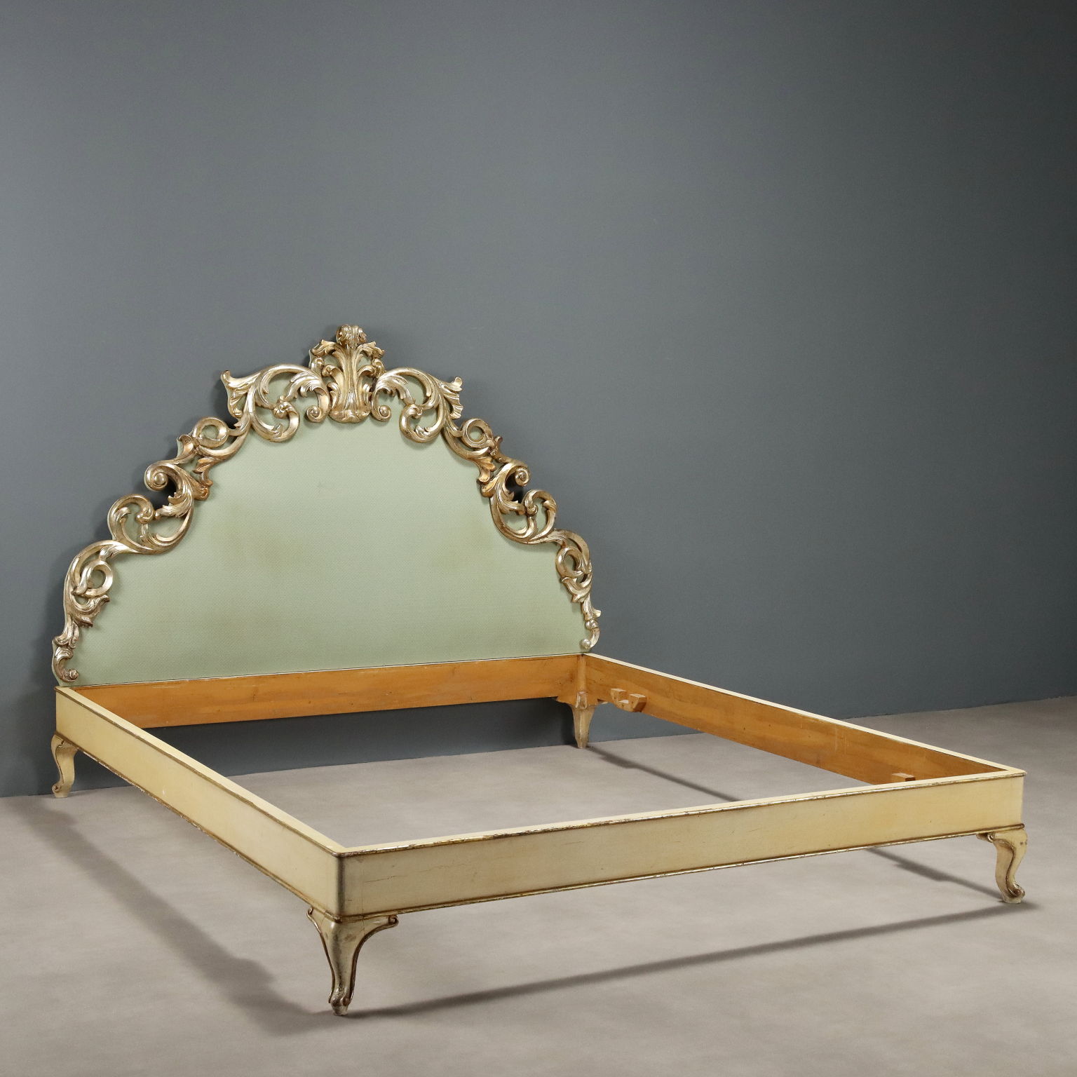 Double bed in lacquered wood, headboard with fabric-covered panel enriched with leafy and scroll carvings in silver leaf, wavy feet. Italy, 20th century.