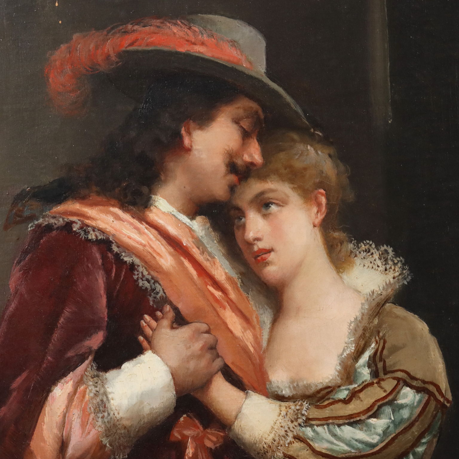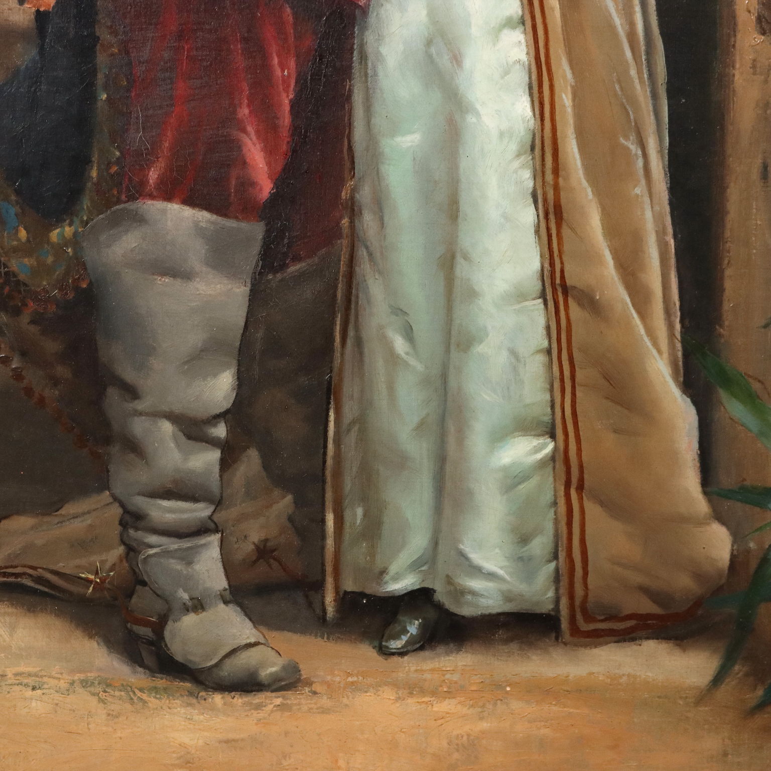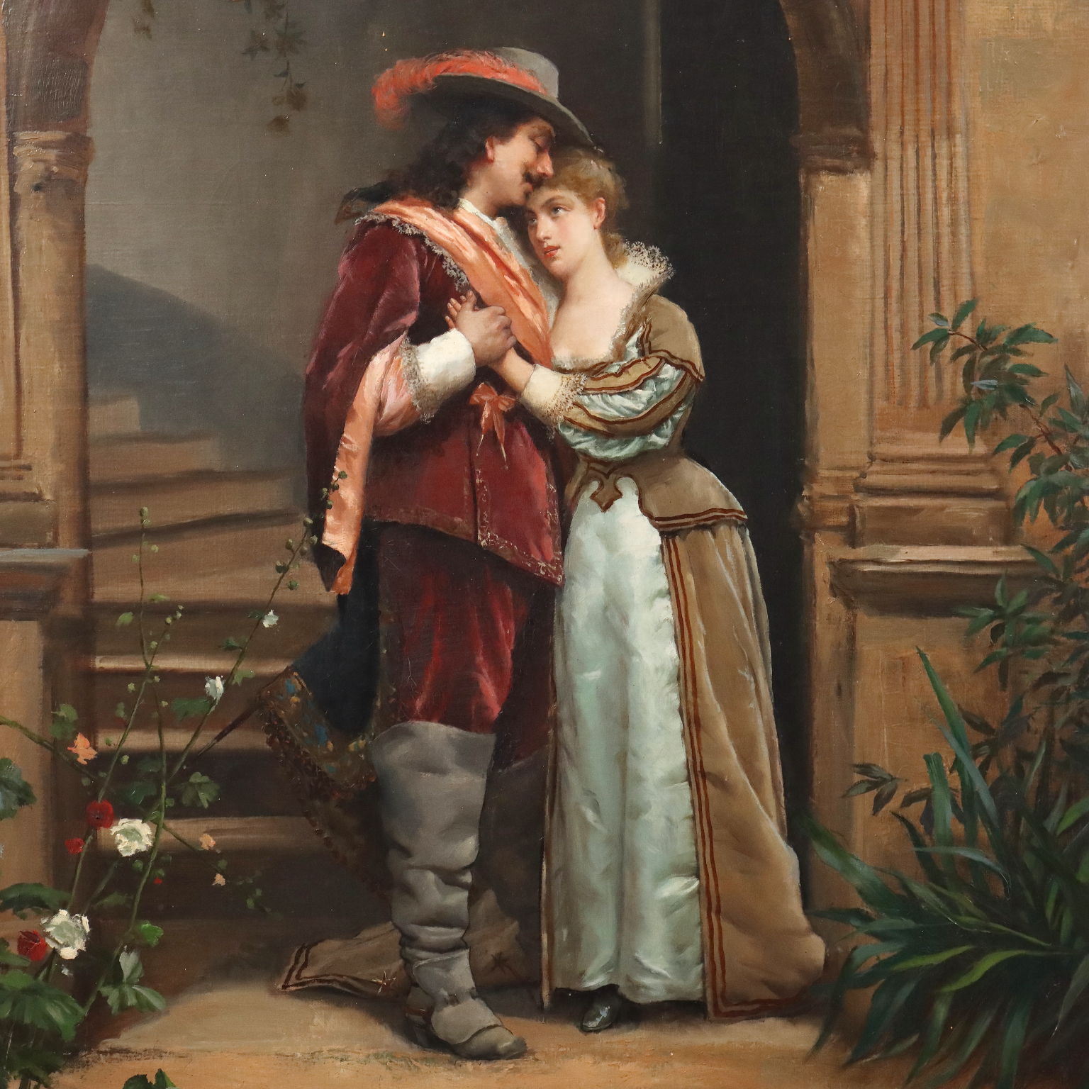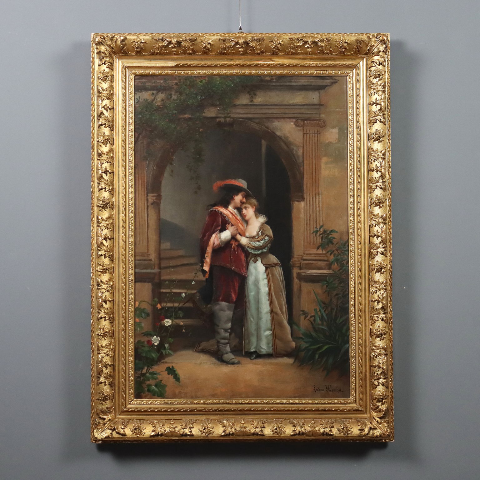 Oil on canvas. Signed lower right. Louis Hippolyte Mouchot (who later took the name Ludovic) made a name for himself in 19th-century Paris for his portraits and especially for his gallant genre scenes, often featuring 17th- and 18th-century characters and settings, inspired by the swashbuckling literature popular in the 19th century (think of Alexandre Dumas' The Three Musketeers). The work is presented in a mid-20th-century gilded frame.