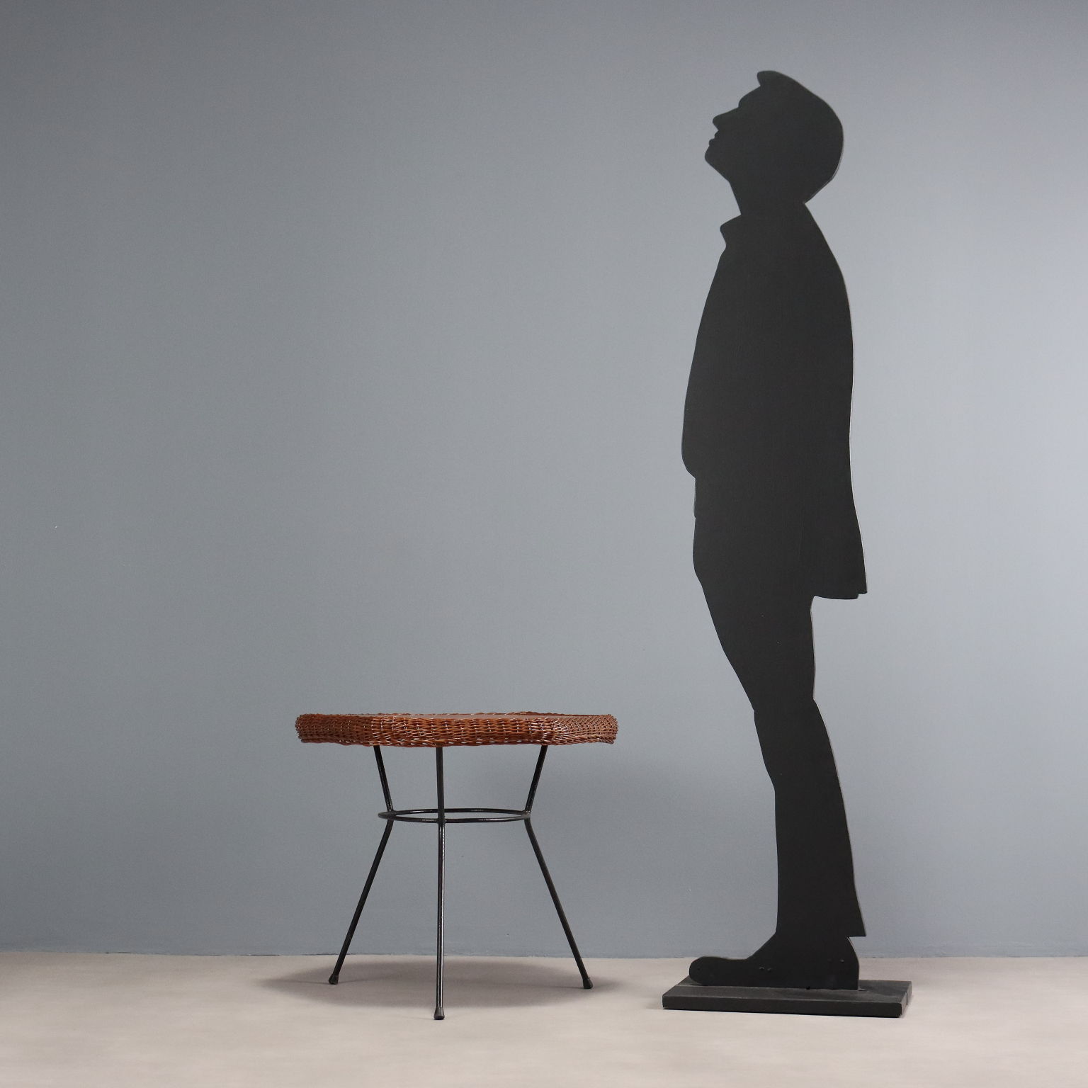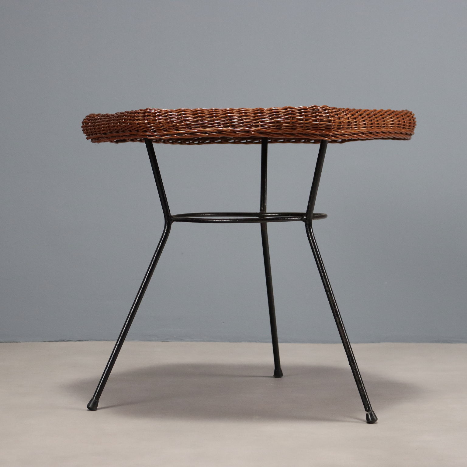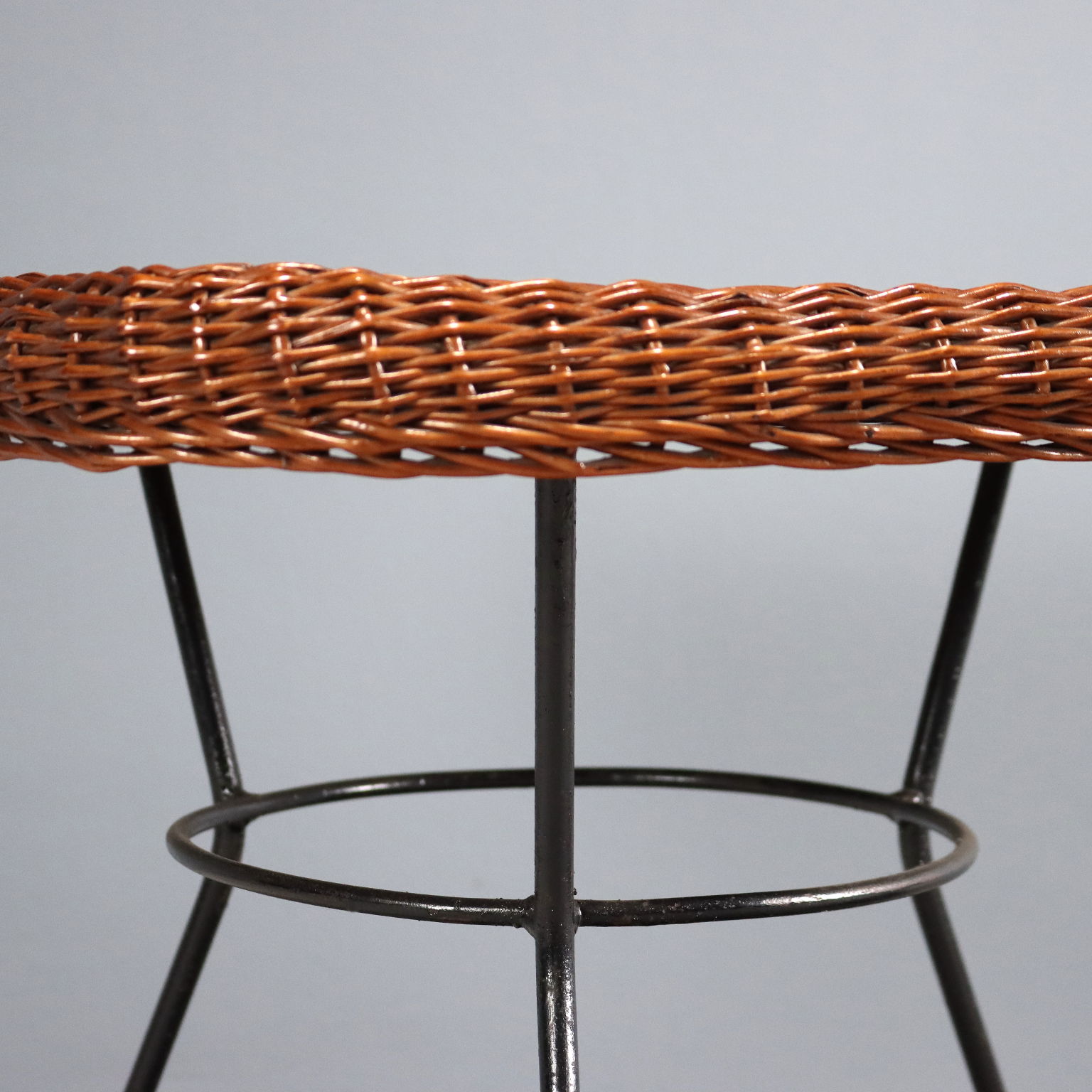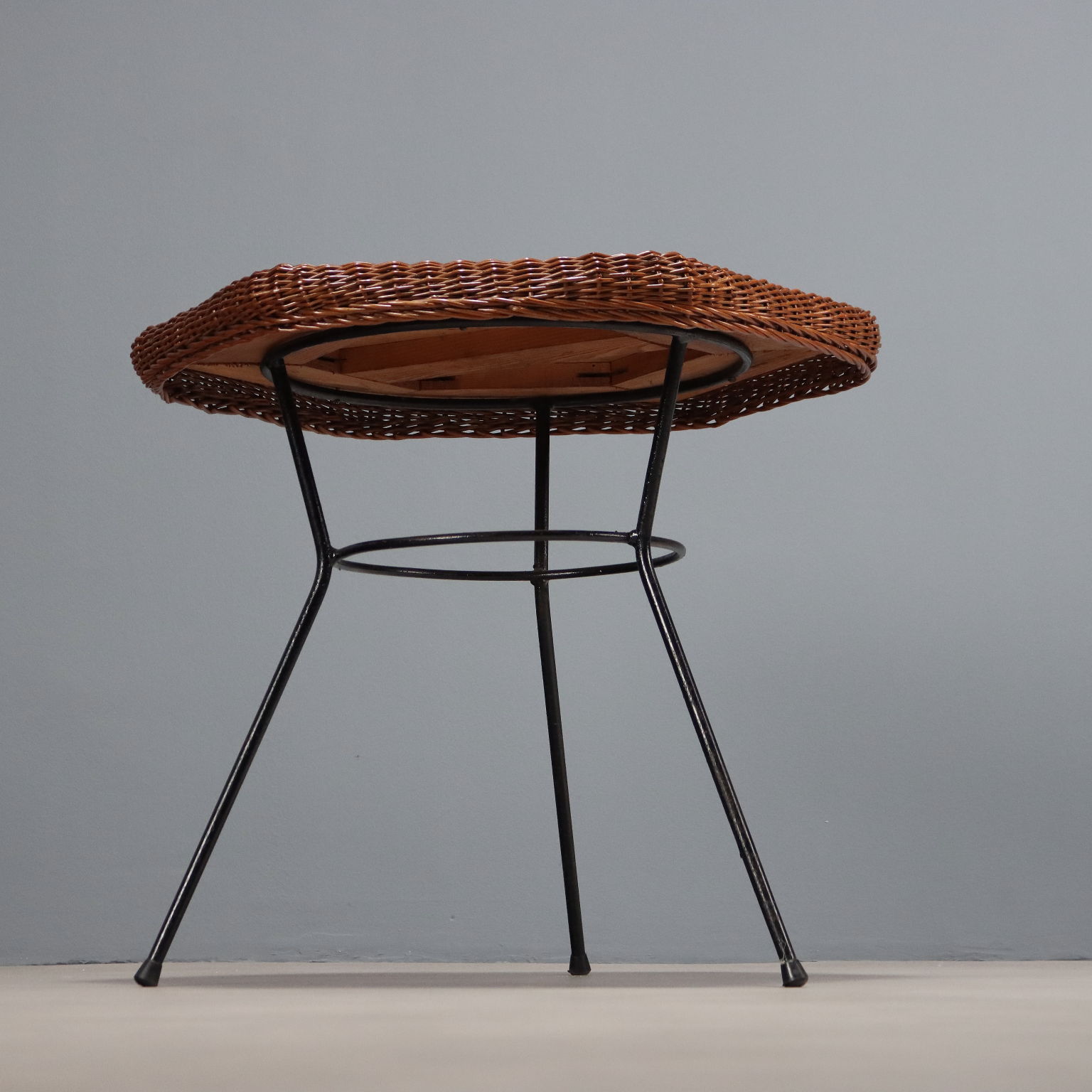 Coffee table with black enamelled metal legs and wooden top and rattan edge.