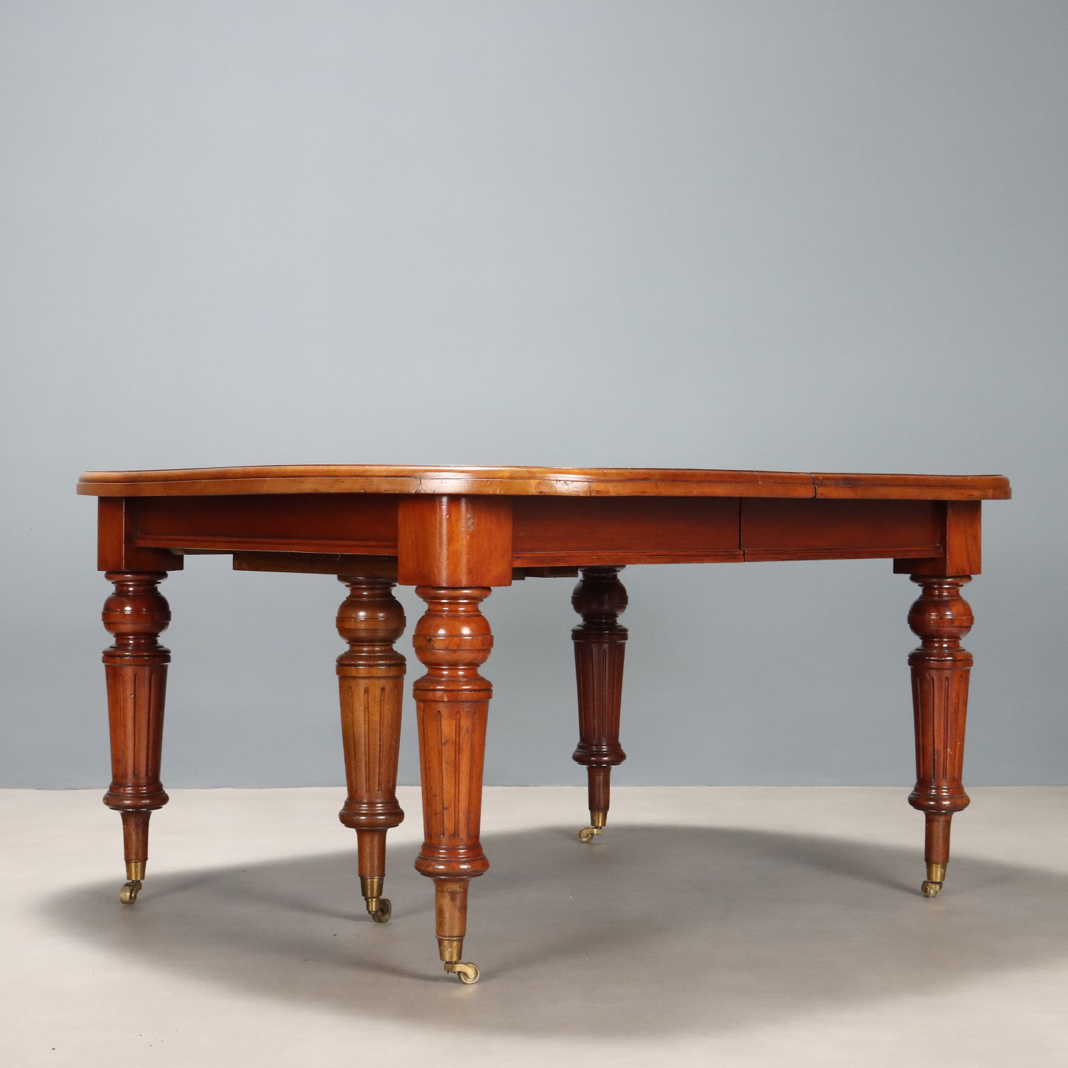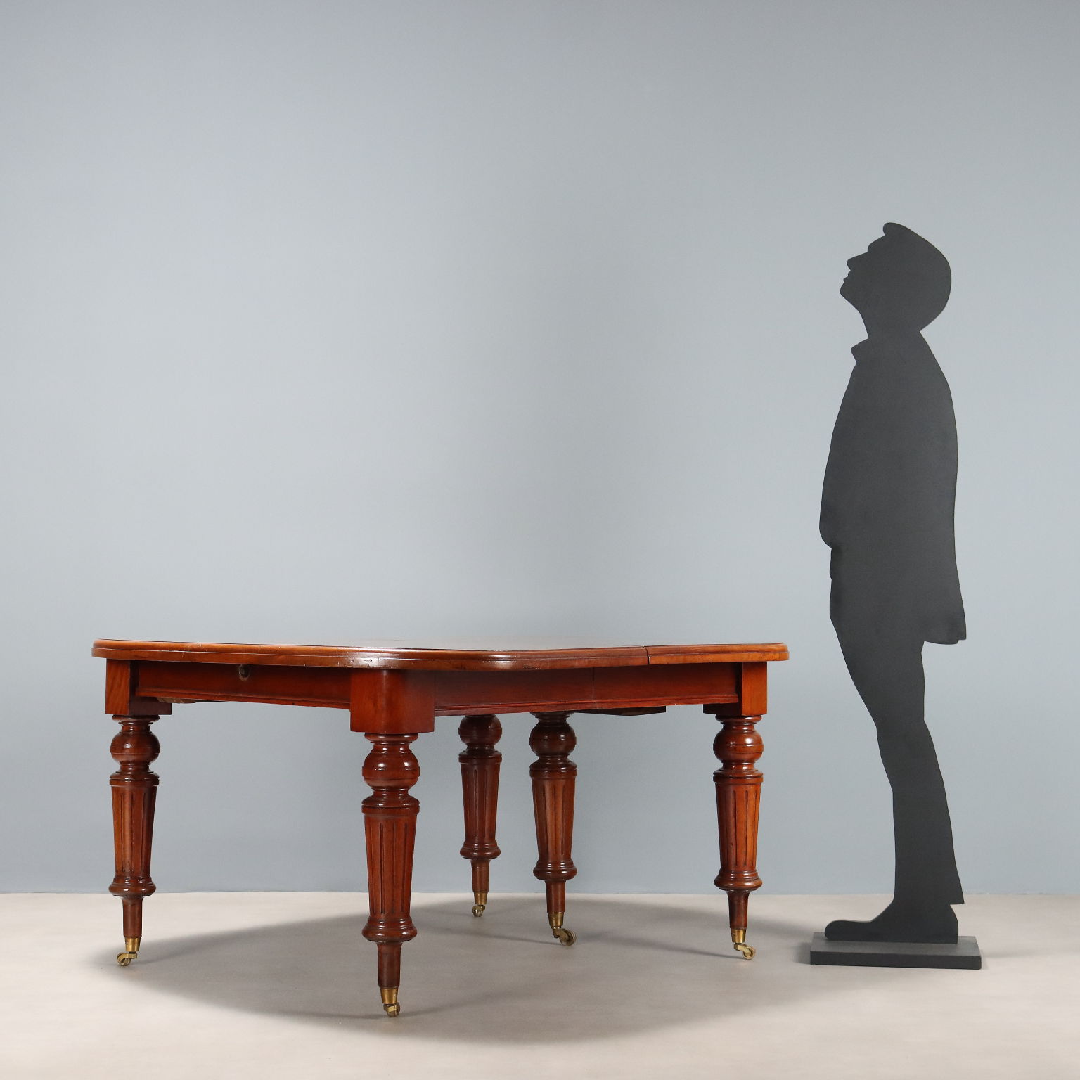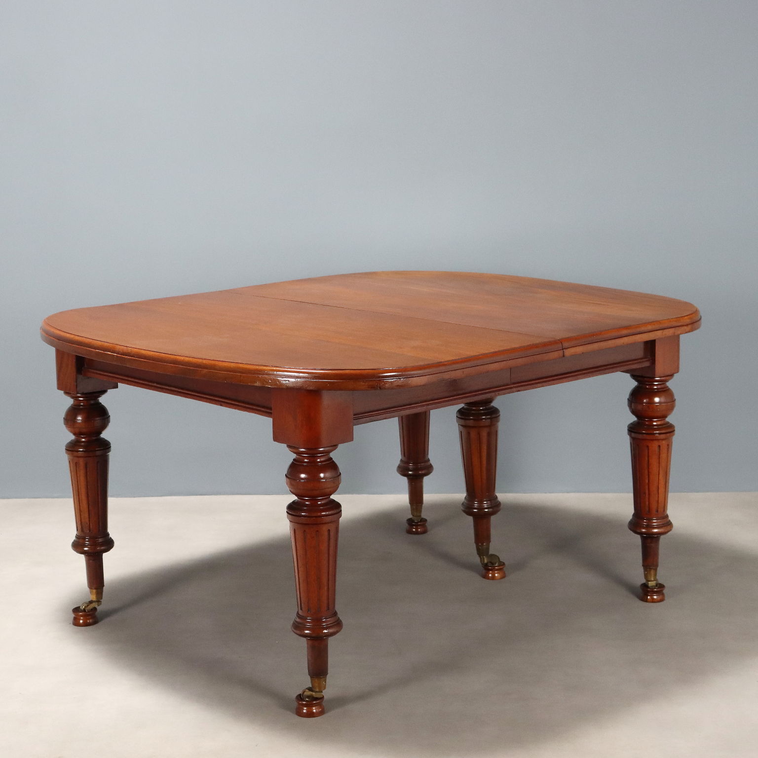Mahogany table extendable by crank and rack. Four turned legs with gouges, topped with brass cups and casters. Wooden floor protectors, three extensions. England, late 19th/early 20th century.
