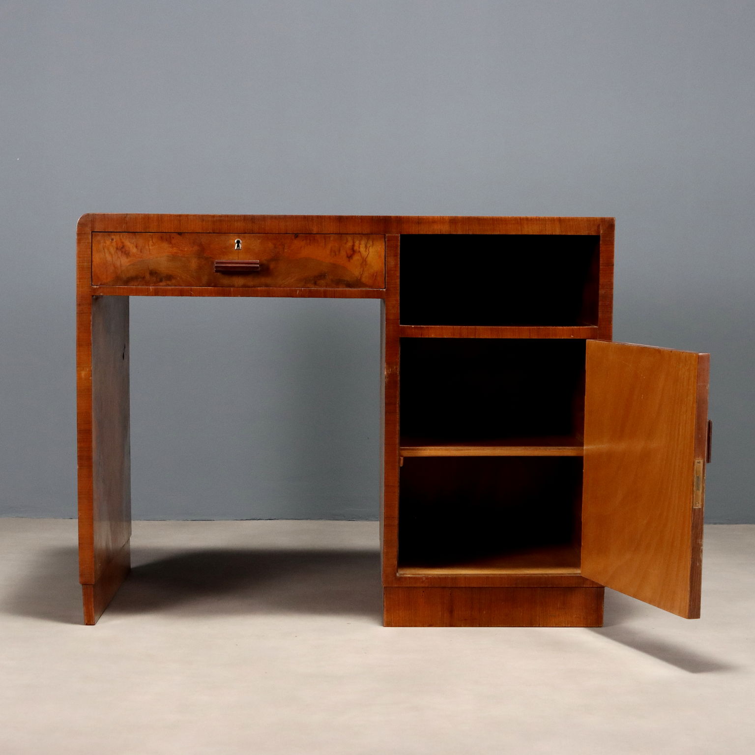 Art Deco writing desk in mahogany veneer and mahogany burl. Front with under-counter drawer, open compartment, and side door. Glass top. Italy, first quarter of the 20th century.