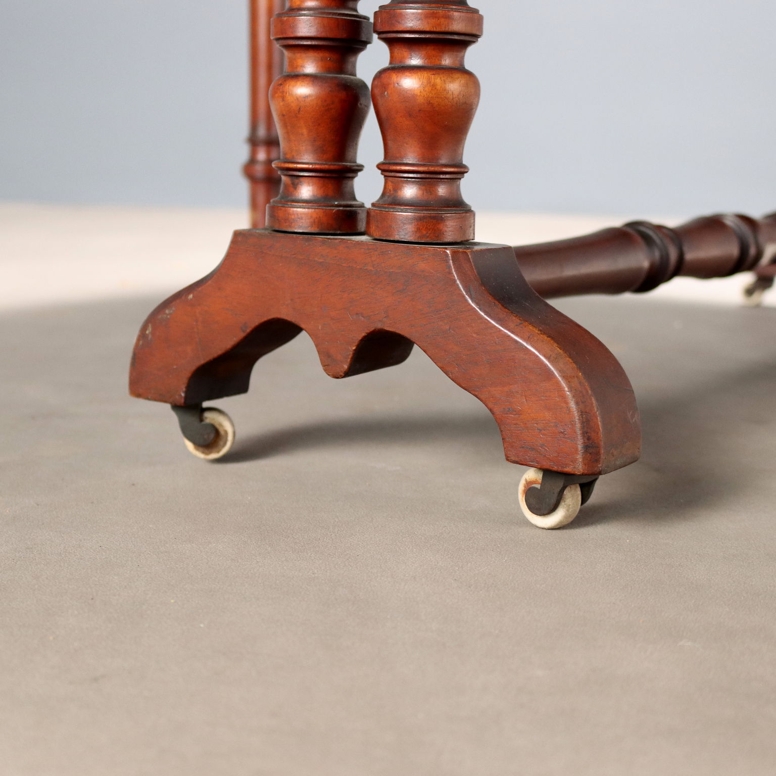 Mahogany hinged table. Pair of turned side legs resting on bracket feet and casters, hinges supported by single, turned, opening legs with casters. England, late 19th/early 20th century.