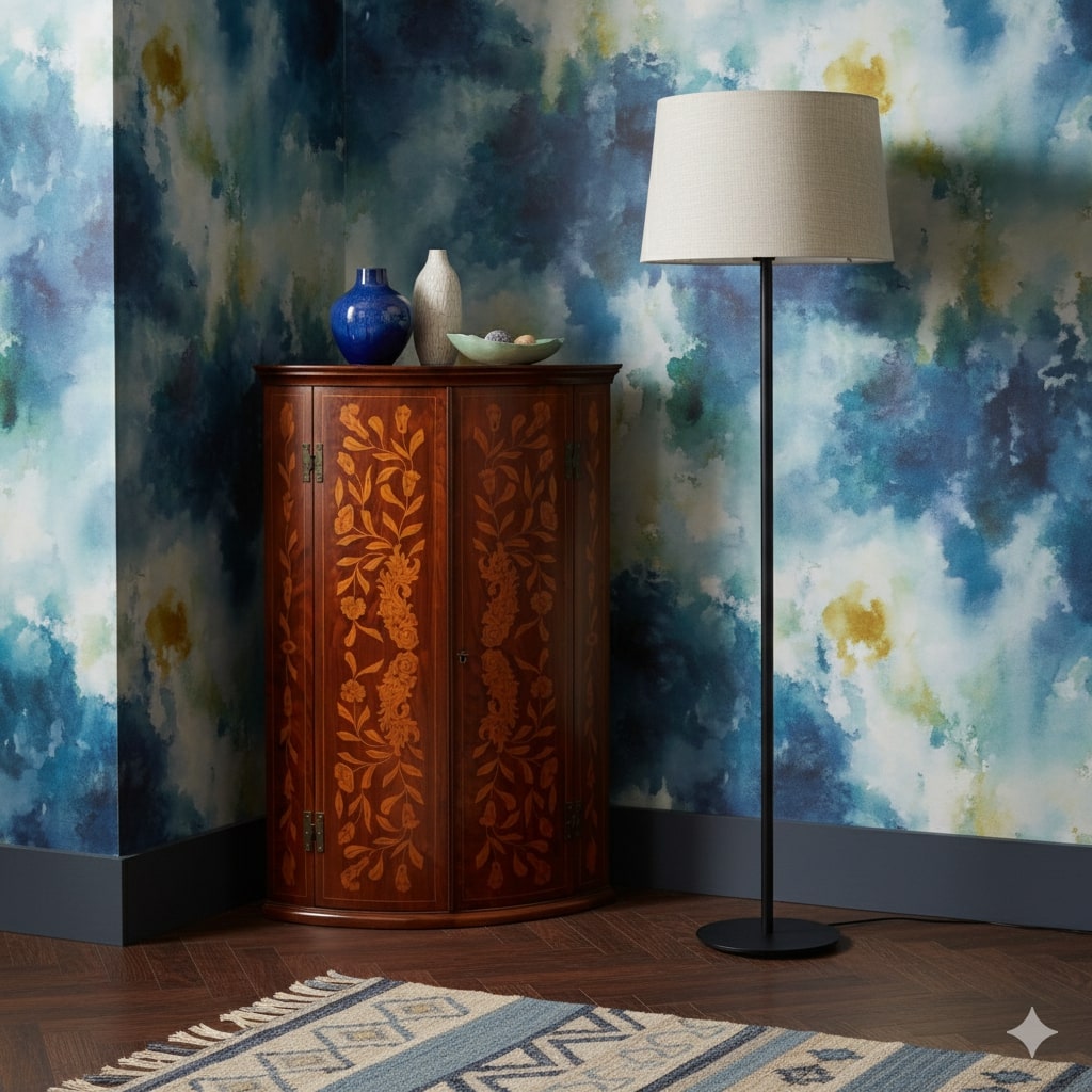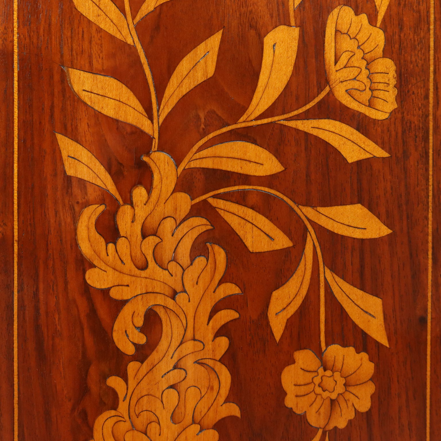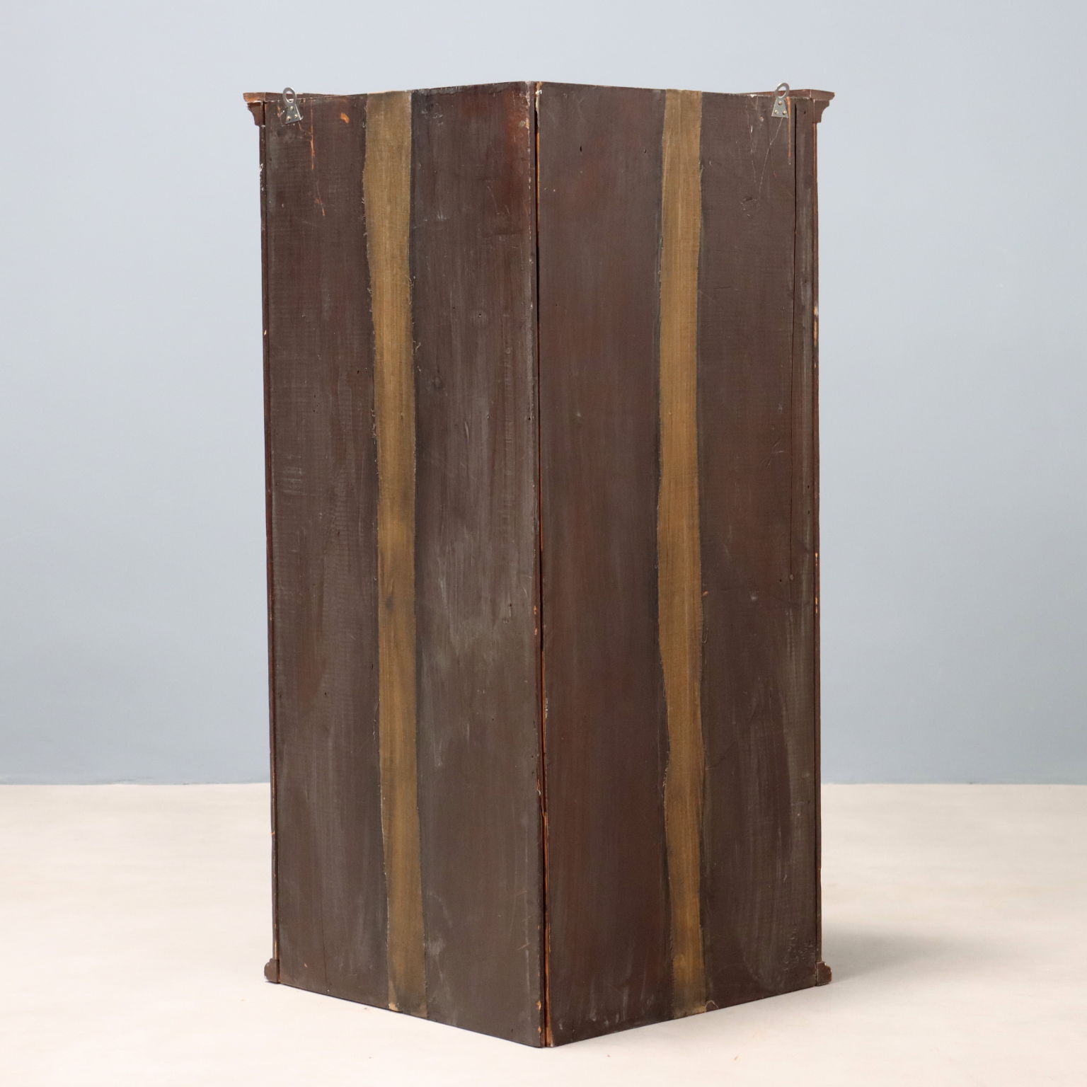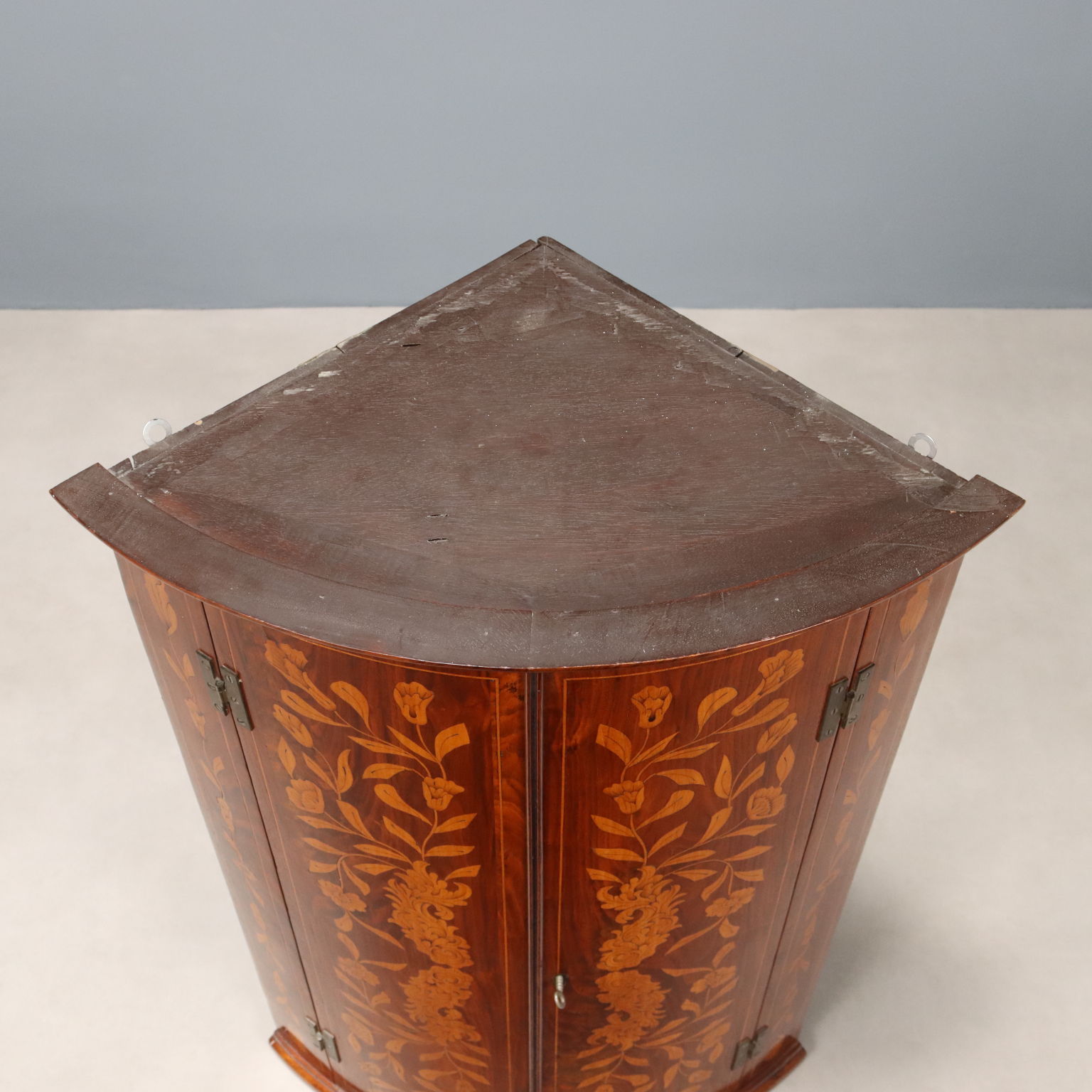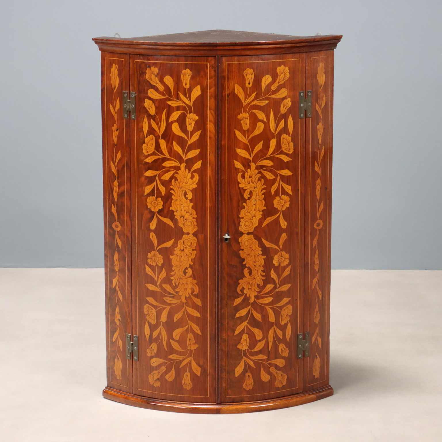 A Dutch half-moon walnut corner cabinet, wall-mounted. Two doors, with floral and leafy maple inlays throughout. Netherlands, 19th century.