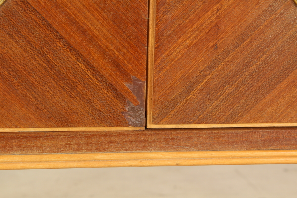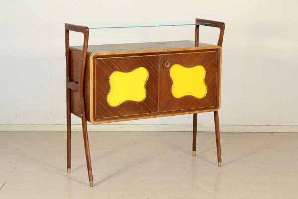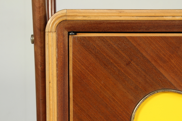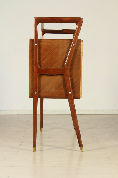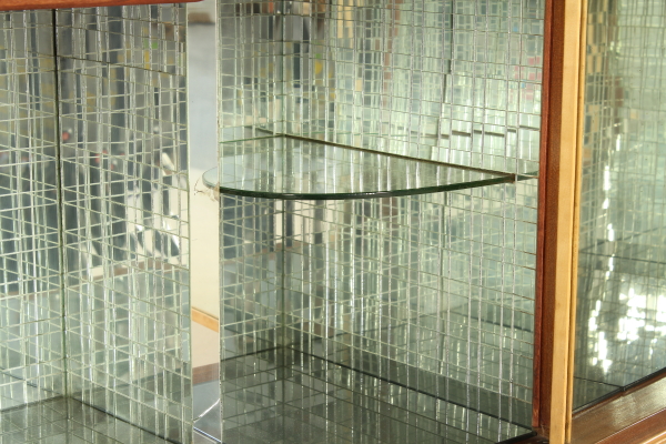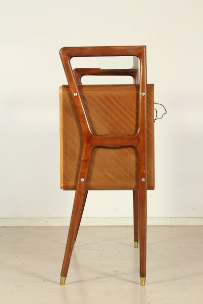 Mobile bar; Rosewood veneered wood, glass, Interior covered with painted back in the mirror. Good condition, shows little signs of wear.