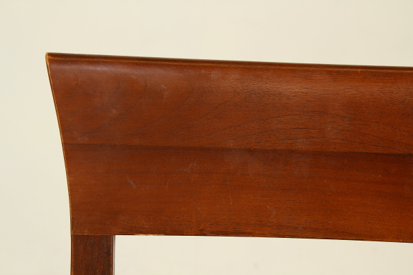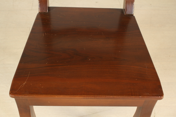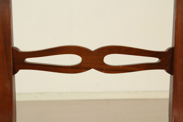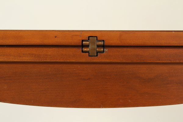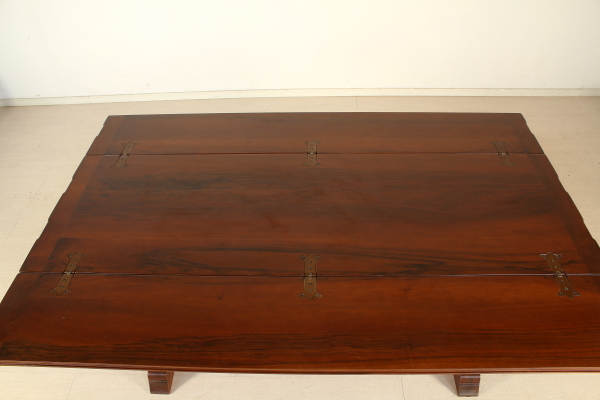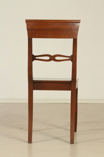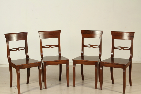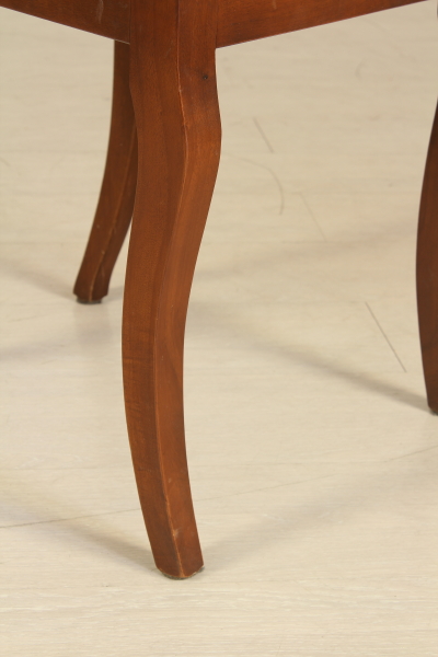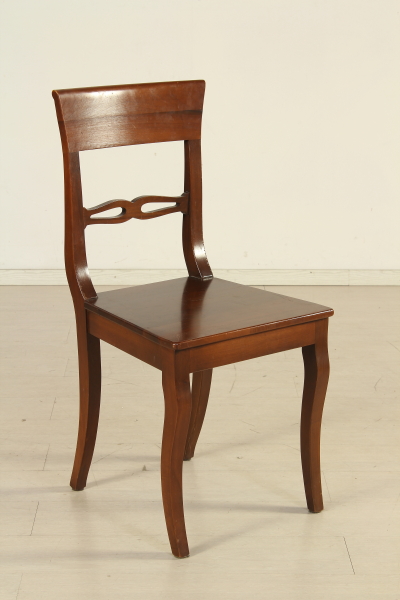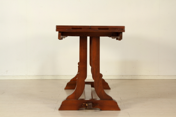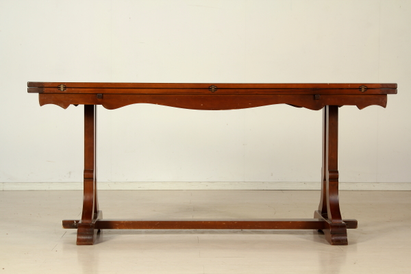 Supported by legs ending with ciabatta and connected by cross. The plan has two open shelves to the fore. Pull-out rod for support. Four chairs with wood seat.