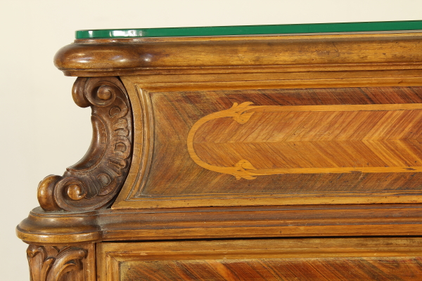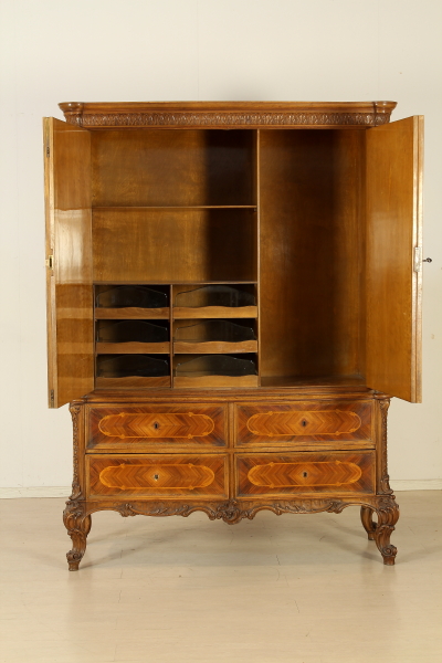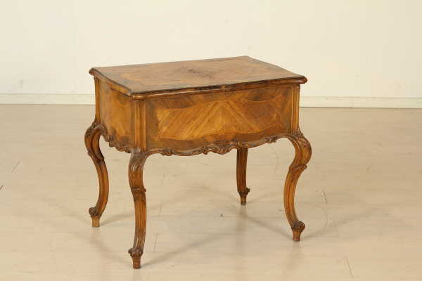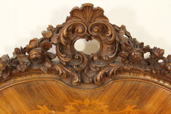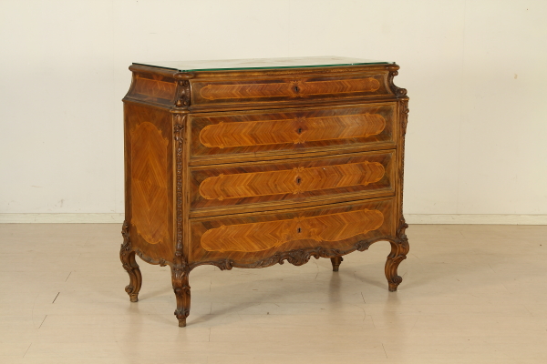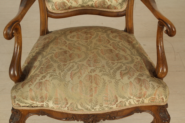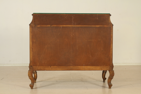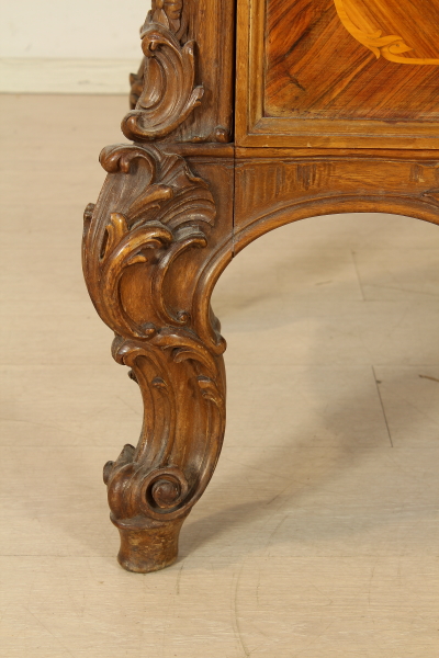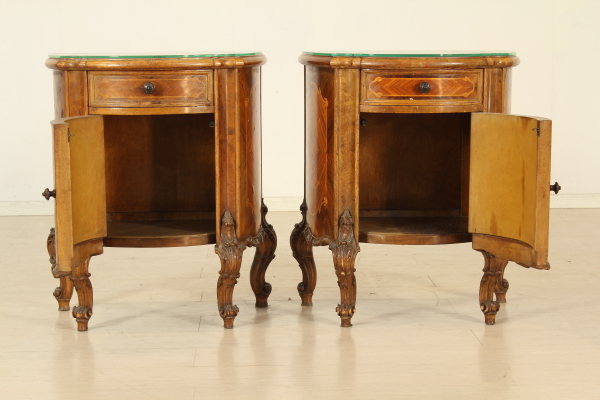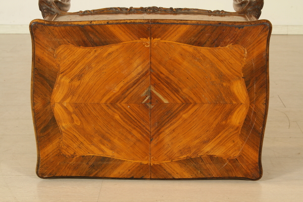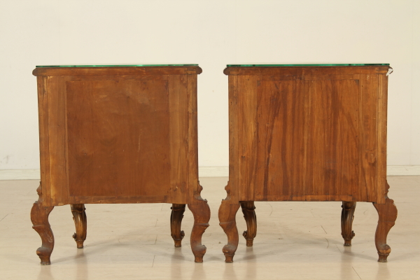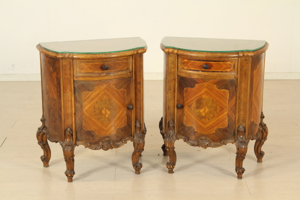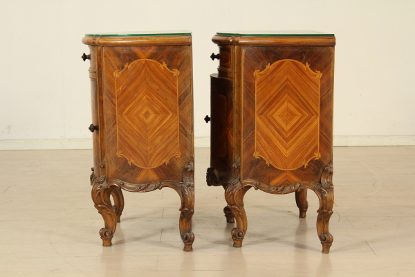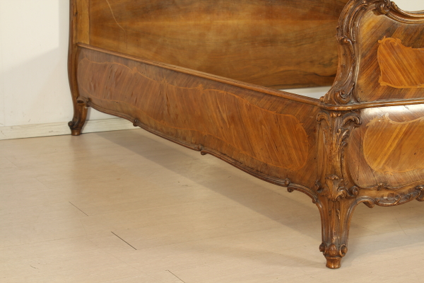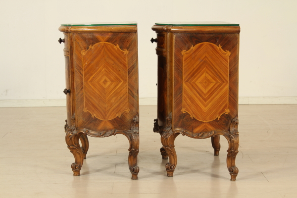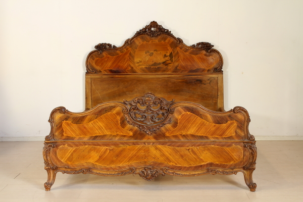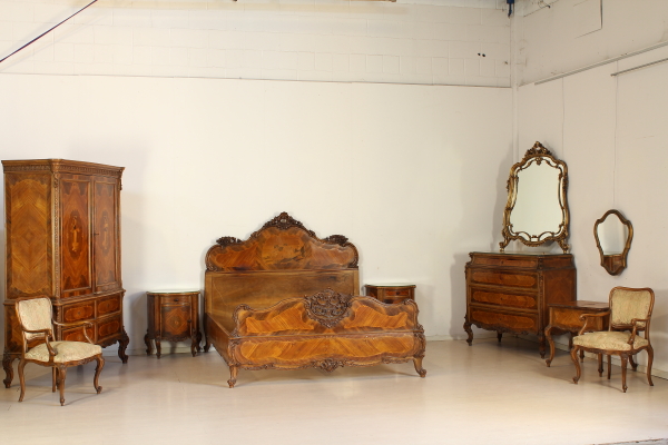 Straight line from the foot moved and has fine carved inlays and carved frames. Composed of double bed (153x180x211), dresser with mirror for URN (108x117x52), pair bedside tables (70x57x37), two cabinet doors four drawers (200x140x55), pair of armchairs (82x52x46), specchierina (122x104x6), work table with sliding floor (63x66x47).