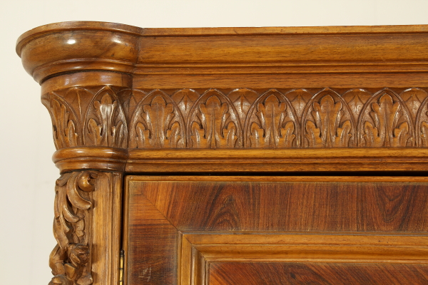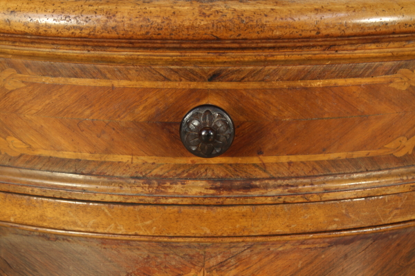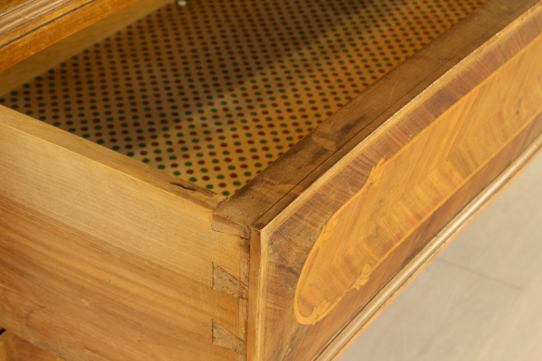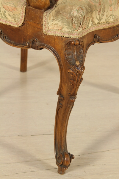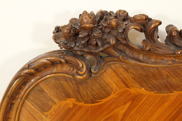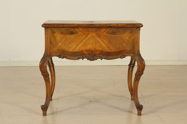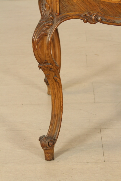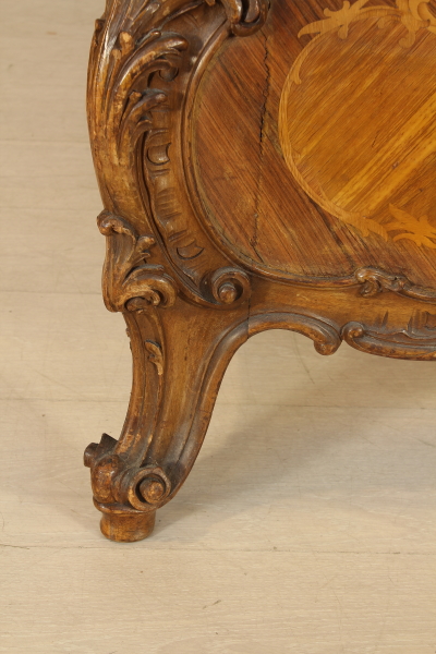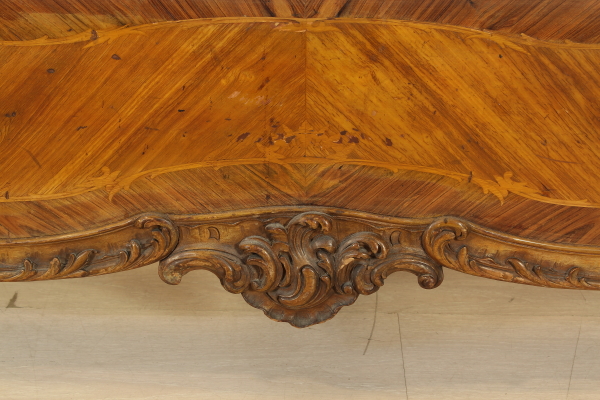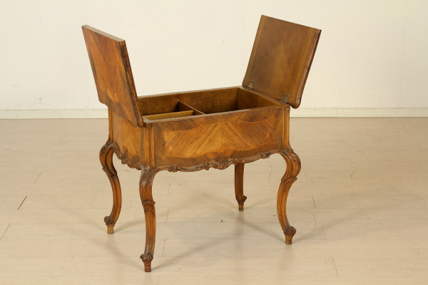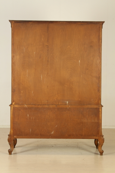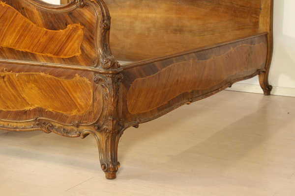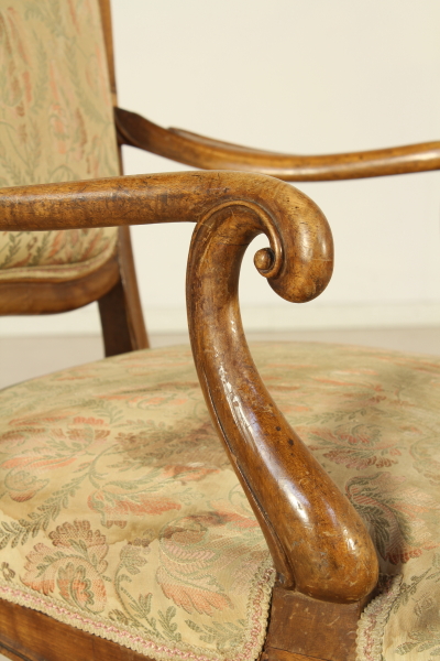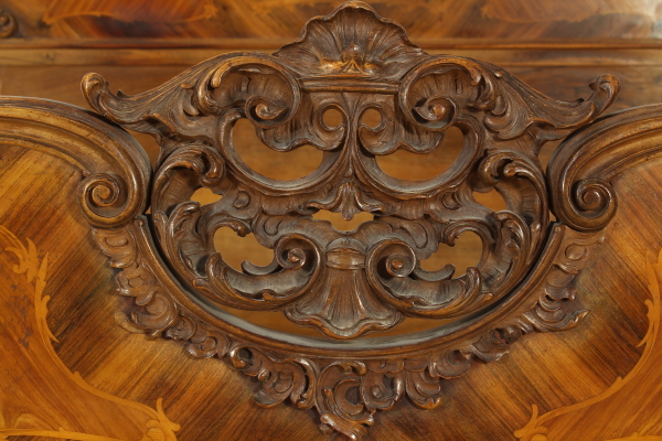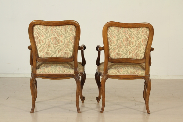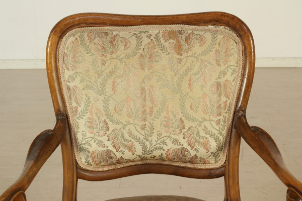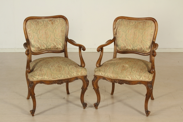 Straight line from the foot moved and has fine carved inlays and carved frames. Composed of double bed (153x180x211), dresser with mirror for URN (108x117x52), pair bedside tables (70x57x37), two cabinet doors four drawers (200x140x55), pair of armchairs (82x52x46), specchierina (122x104x6), work table with sliding floor (63x66x47).