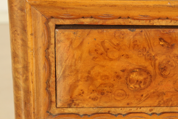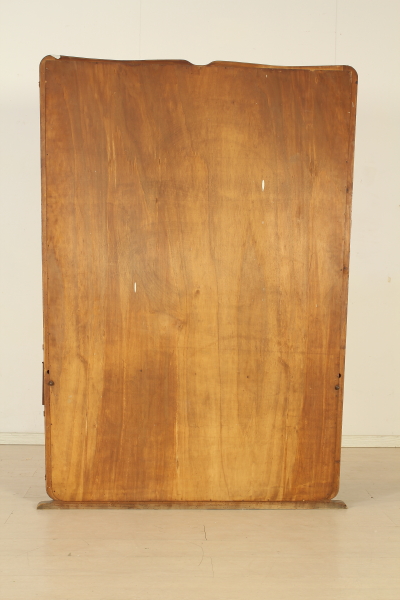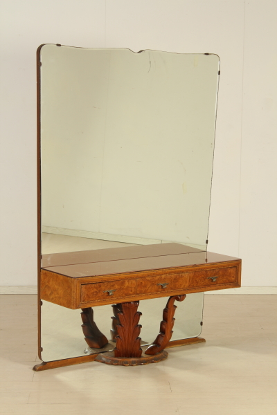 Peteneuse 30 years with three drawers; Walnut veneered wood, carved wood, painted, retro glass mirror. Good condition, shows little signs of wear.
