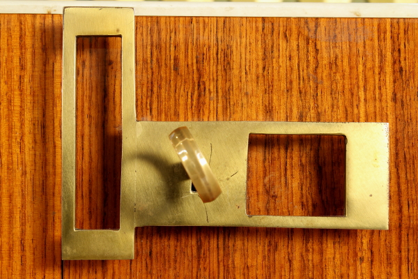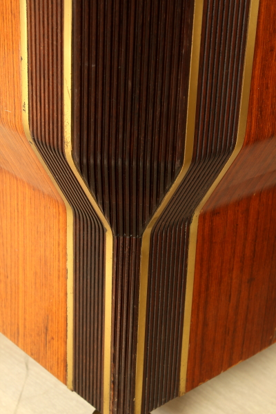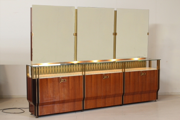 Mobile 50 years, elegant buffet Cabinet; Rosewood veneered wood and lacquered interiors, glass and marble floor, decorated wooden cake stand, mirror on a wooden frame, brass details. Good condition, shows little signs of wear.