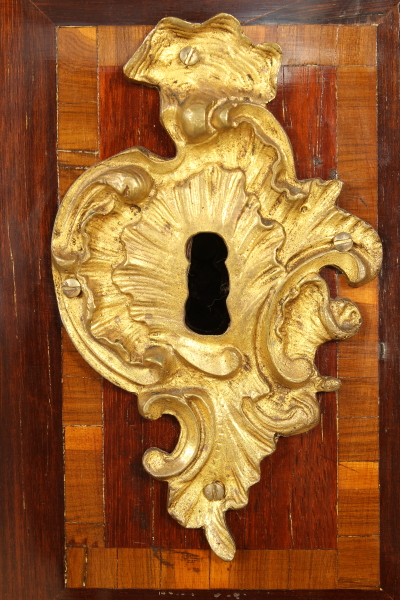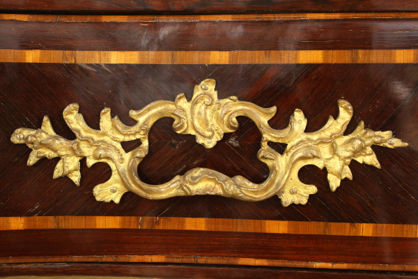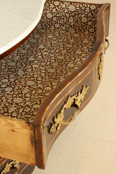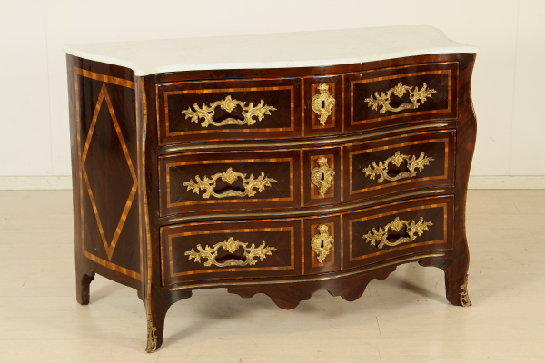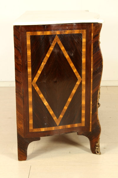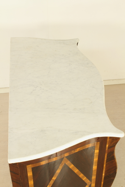 Three-Drawer Dresser moved with inlaid rosewood reserves, fruit wood and amaranth. On the profiles of the drawers and of the wooden lastronatura shaped uprights of pruno di testa. Hardware and gilt bronze friezes. Carrara marble floor.