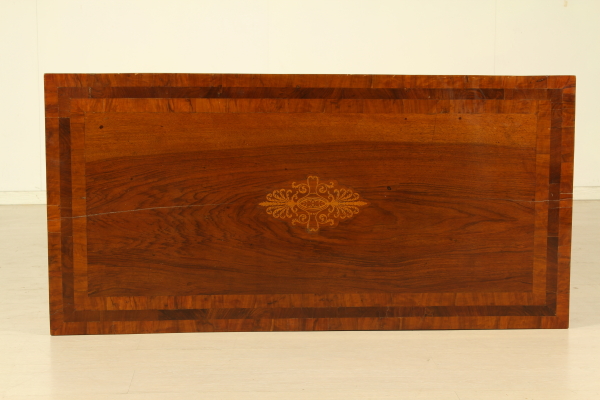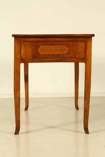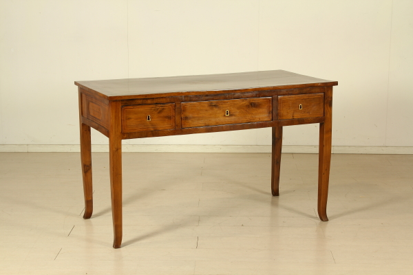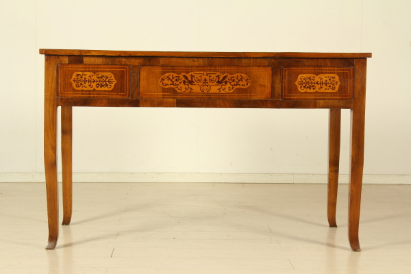 Writing desk from solid walnut three drawers with threaded Maple fronts. Top with the edge with olive and walnut. Four pyramid-trunk legs with final part slightly move. The mobile has undergone restorations and inlaid reserves are nineteenth-century era.