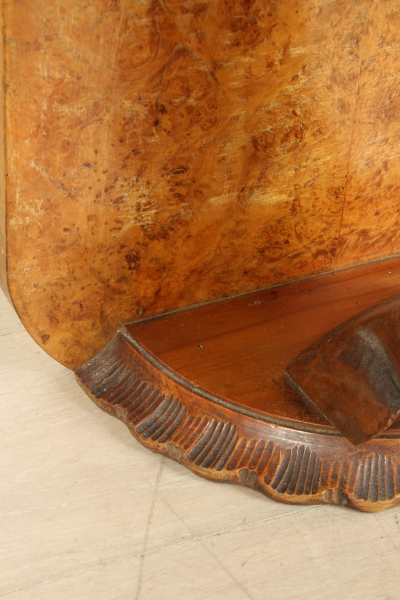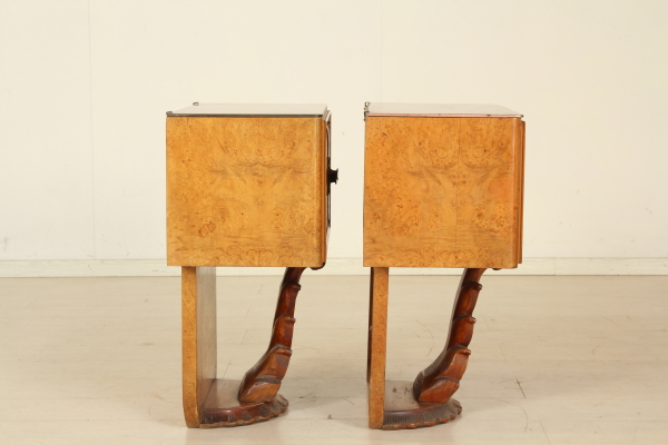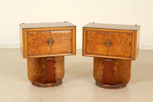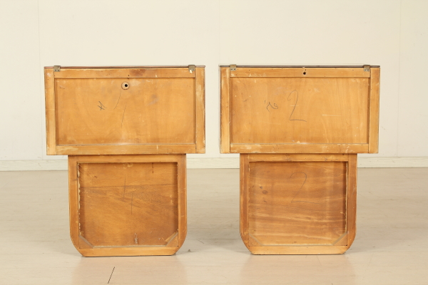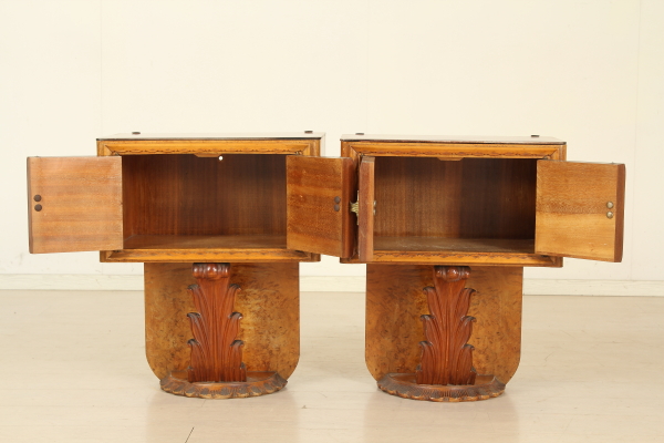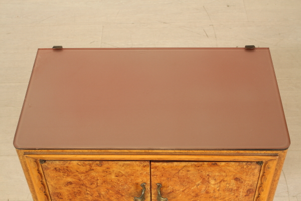 Pair of Nightstands 30 years; Walnut veneered wood, carved wood, glass back varnished. Good condition, show little signs of wear.