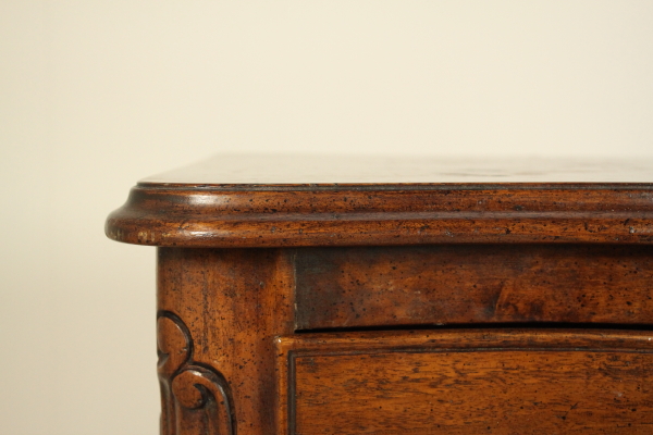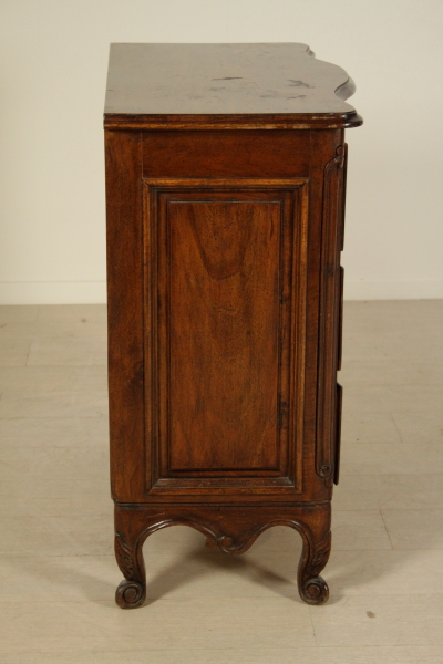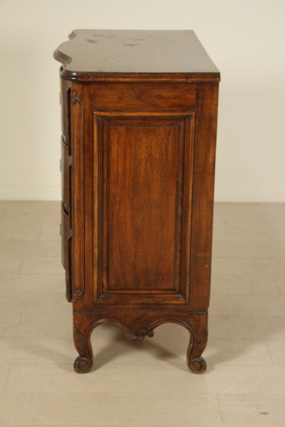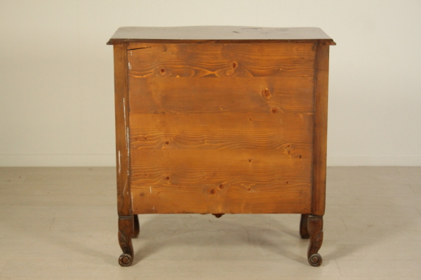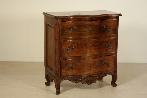 Style COMMODE in. Moved on the front is supported by CURL with legs carved apron. Features three drawers with engraved profile. Notched and carved pillars. Shaped top.