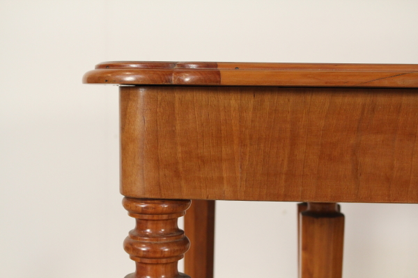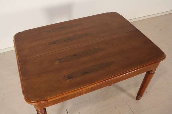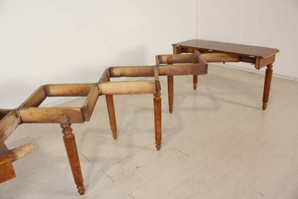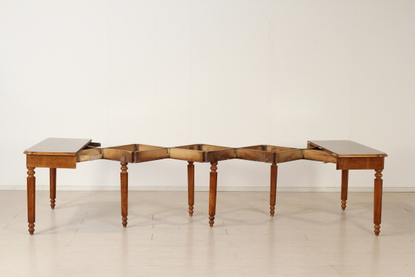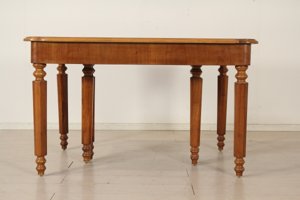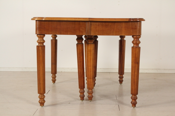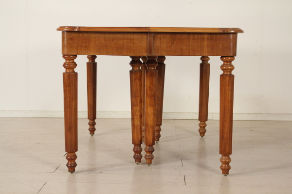 Extending table. Supported by eight octagonal legs in Cherry and beech. Central legs open while opening the table. Walnut veneer fascia. Openable shaped top with walnut.