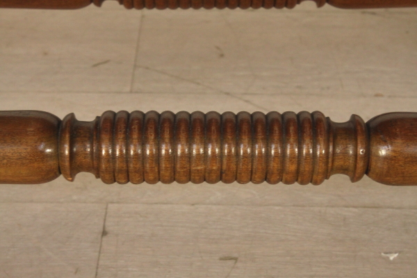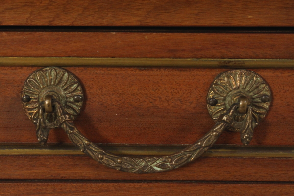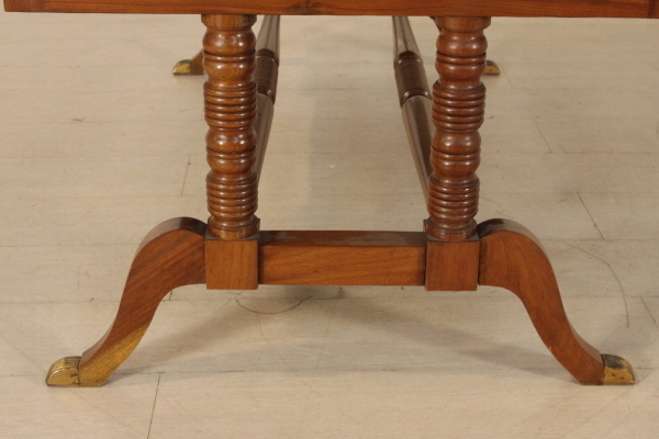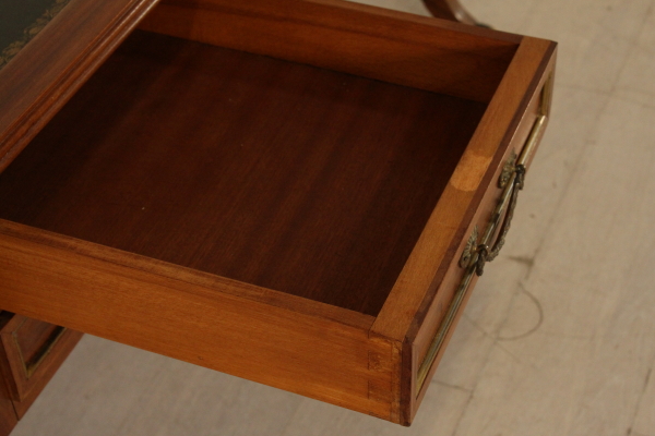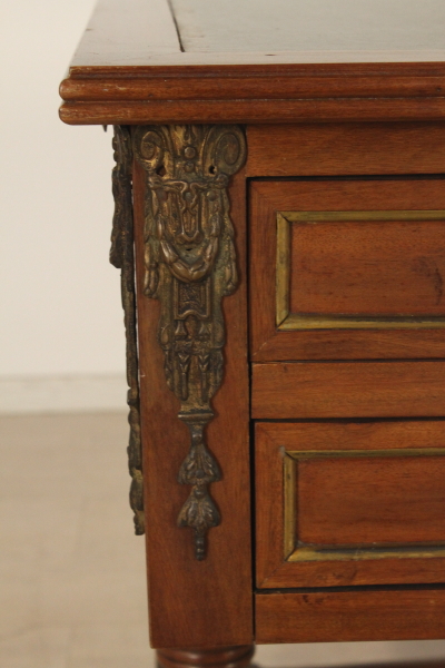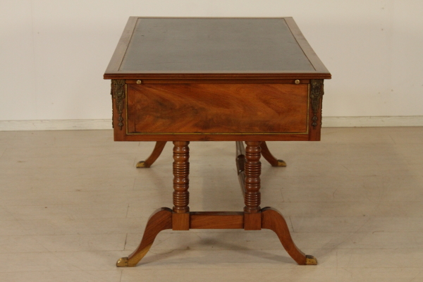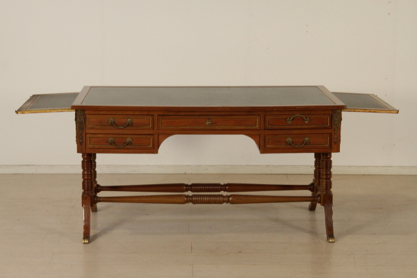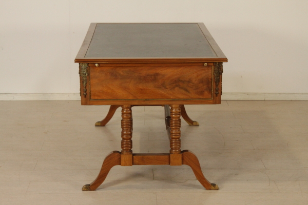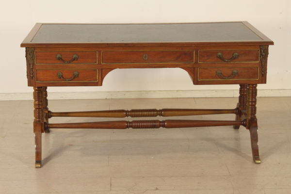 Central desk. Straight from Centre desk turned legs ending with foot moved with brass liners. five drawers on the front, on the side opposite the corresponding drawer faux. In the hips removable drawers with inset leather top. Floor with leather detail. Bronze friezes.