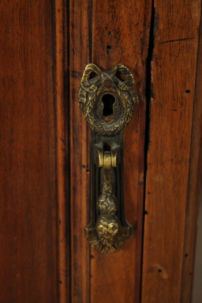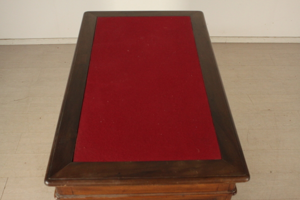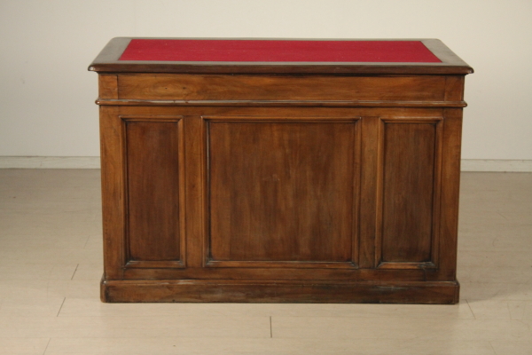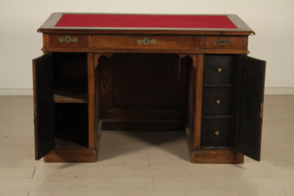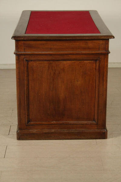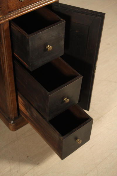 Central desk. Hundred desks run by pair of sleeves with doors. The right door conceals three drawers. Floor with cloth insert with solid walnut Board.Three aligned drawers subplan.