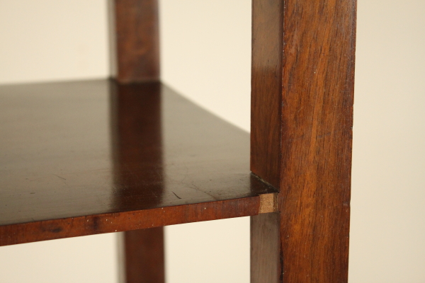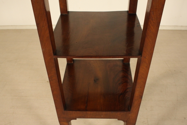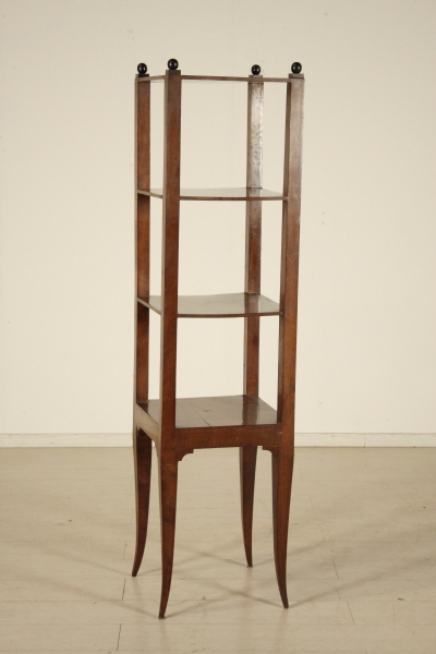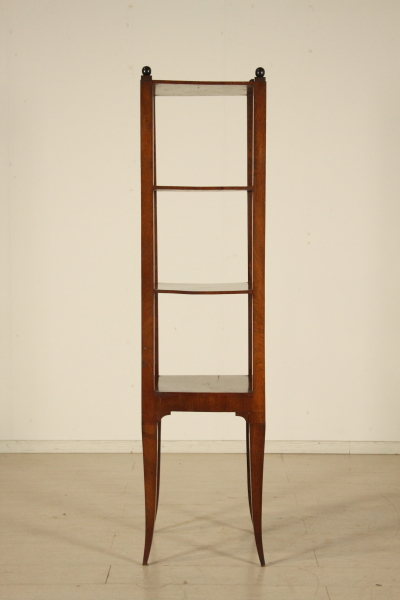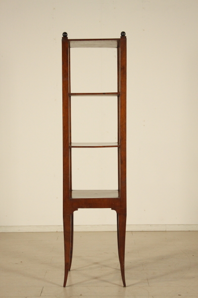 Biedermeier Etagere. Supported by uprights and Fruitwood accidentals ending at Sabre. Has four shelves in Walnut veined and four spheres ebanizzate to close the uprights.