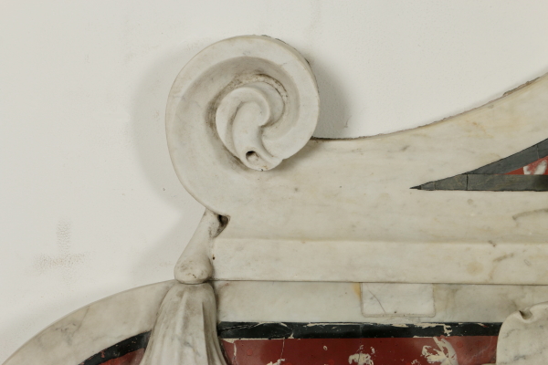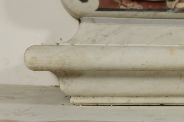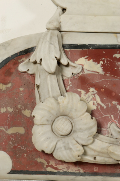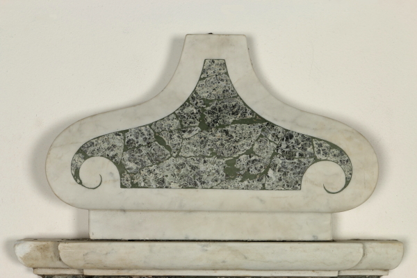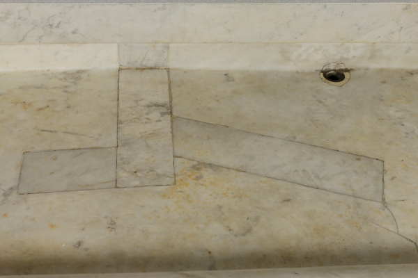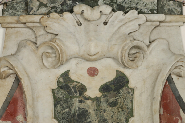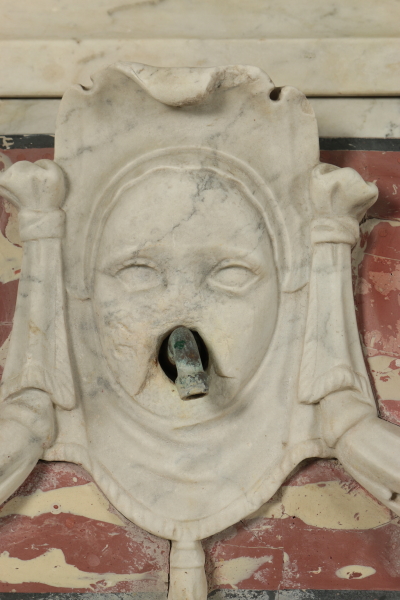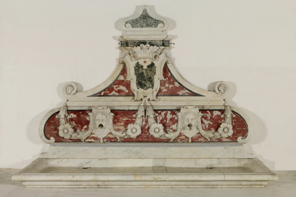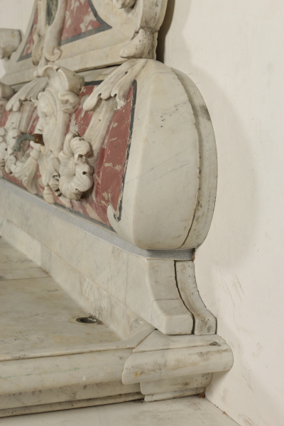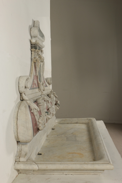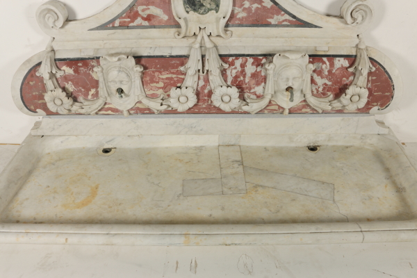 Raised with Central cartouche and mascheroni connected by floral volutes. Parts inlaid polychrome marble. Carrara marble bath. Underwent renovations.