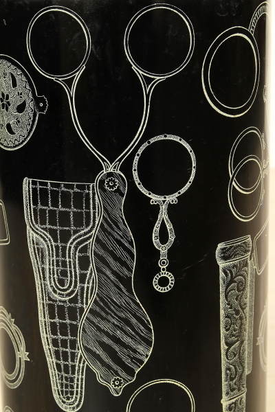 Metal cylindrical screen printed designs. Signs of wear and tear.